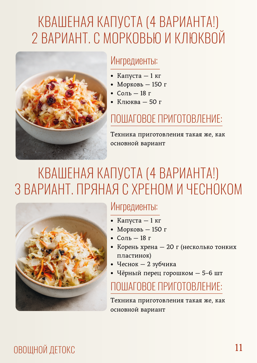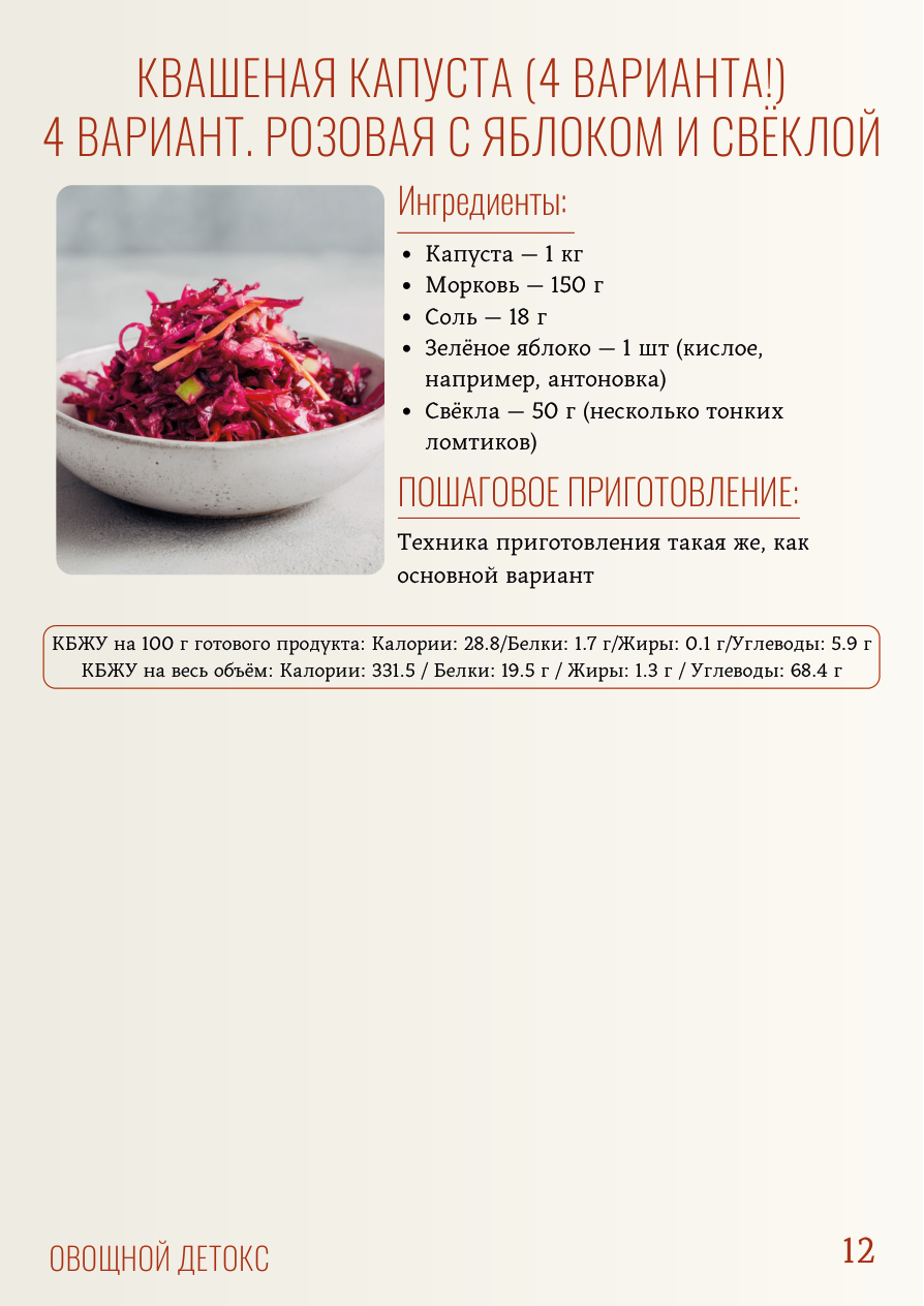 КВАШЕНАЯ КАПУСТА (4 ВАРИАНТА!) 2 ВАРИАНТ. С МОРКОВЬЮ И КЛЮКВОЙ КВАШЕНАЯ КАПУСТА (4 ВАРИАНТА!) 3 ВАРИАНТ. ПРЯНАЯ С ХРЕНОМ И ЧЕСНОКОМ Ингредиенты: Ингредиенты: Капуста - 1 кг Морковь - 150 г Соль - 18 г Клюква - 50 г Капуста - 1 кг Морковь - 150 г Соль - 18 г Корень хрена - 20 г (несколько тонких пластинок) Чеснок - 2 зубчика Чёрный перец горошком - 5-6 шт 11 ПОШАГОВОЕ ПРИГОТОВЛЕНИЕ: ПОШАГОВОЕ ПРИГОТОВЛЕНИЕ: Техника приготовления такая же, как основной вариант Техника приготовления такая же, как основной вариант ОВОЩНОЙ ДЕТОКС КВАШЕНАЯ КАПУСТА (4 ВАРИАНТА!) 4 ВАРИАНТ. РОЗОВАЯ С ЯБЛОКОМ И СВЁКЛОЙ Ингредиенты: Капуста - 1 кг Морковь - 150 г Соль - 18 г Зелёное яблоко - 1 шт (кислое, например, антоновка) Свёкла - 50 г (несколько тонких ломтиков) 12 ПОШАГОВОЕ ПРИГОТОВЛЕНИЕ: Техника приготовления такая же, как основной вариант ОВОЩНОЙ ДЕТОКС КБЖУ на 100 г готового продукта: Калории: 28.8/Белки: 1.7 г/Жиры: 0.1 г/Углеводы: 5.9 г КБЖУ на весь объём: Калории: 331.5 / Белки: 19.5 г / Жиры: 1.3 г / Углеводы: 68.4 г