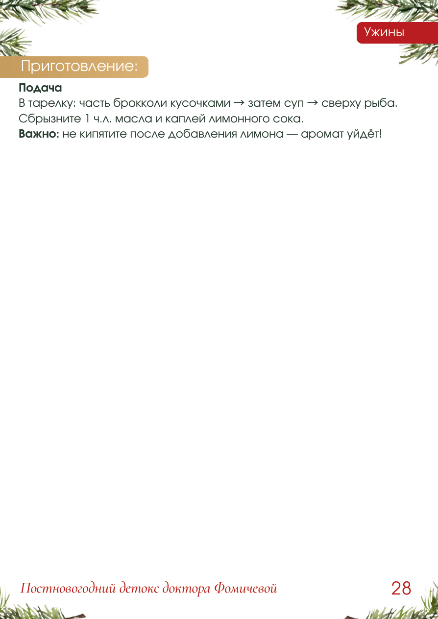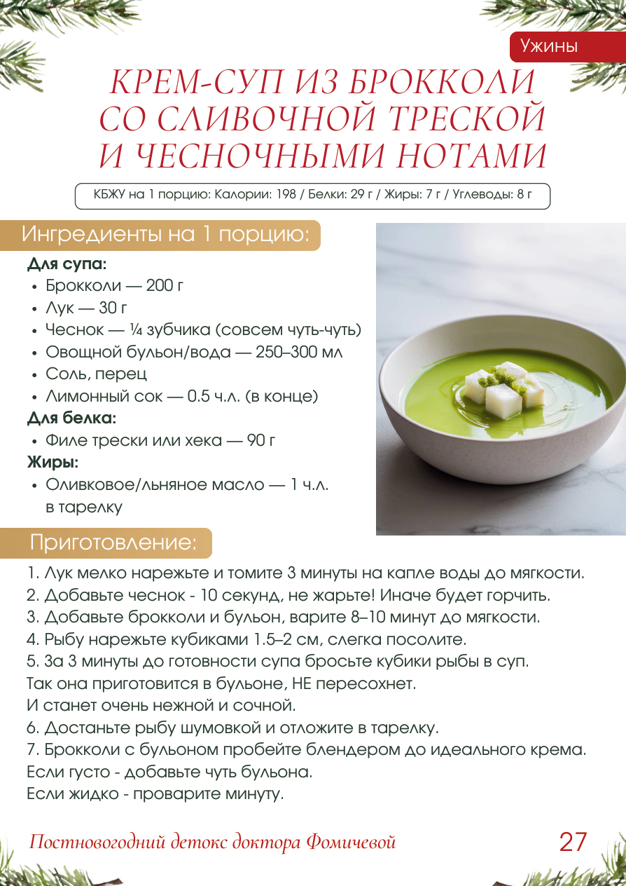 Ужины КРЕМ-СУП ИЗ БРОККОЛИ CO СЛИВОЧНОЙ ТРЕСКОЙ И ЧЕСНОЧНЫМИ НОТАМИ КБЖУ на 1 порцию: Калории: 198 / Белки: 29 г / Жиры: 7 г / Углеводы: 8 г Ингредиенты на 1 порцию: Для супа: - Брокколи - 200 г - Лук - 30 г - Чеснок - ¼ зубчика (совсем чуть-чуть) - Овощной бульон/вода - 250-300 мл - Соль, перец - Лимонный сок - 0.5 ч.л. в конце) Для белка: - Филе трески или хека - 90 г Жиры: - Оливковое/льняное масло - 1 ч.л. в тарелку Приготовление: 1. Лук мелко нарежьте и томите 3 минуты на капле воды до мягкости. 2. Добавьте чеснок - 10 секунд, не жарьте! Иначе будет горчить. 3. Добавьте брокколи и бульон, варите 8-10 минут до мягкости. 4. Рыбу нарежьте кубиками 1.5-2 см, слегка посолите. 5. За 3 минуты до готовности супа бросьте кубики рыбы в суп. Так она приготовится в бульоне, НЕ пересохнет. И станет очень нежной и сочной. 6. Достаньте рыбу шумовкой и отложите в тарелку. 7. Брокколи с бульоном пробейте блендером до идеального крема. Если густо - добавьте чуть бульона. Если жидко - проварите минуту. П одача Вт арелку: часть брокколи кусочками → затем суп → сверху рыба. Сбрызните 1 ч.л. масла и каплей лимонного сока. Ва жно: не кипятите после добавления лимона - аромат уйдёт! 28 Ужины Приготовление:
