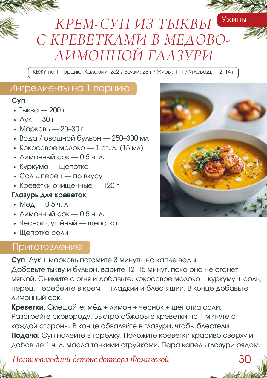 Ужины КРЕМ-СУП ИЗ ТЫКВЫ С КРЕВЕТКАМИ В МЕДОВО- ЛИМОННОЙ ГЛАЗУРИ КБЖУ на 1 порцию: Калории: 252 / Белки: 28 г / Жиры: 11 г / Углеводы: 12-14 г Ингредиенты на 1 порцию: Суп - Тыква - 200 г - Лук - 30 г - Морковь - 20-30 г - Вода / овощной бульон - 250-300 мл - Кокосовое молоко - 1 ст. л (15 мл) - Лимонный сок - 0.5 чл - Куркума - щепотка - Соль, перец - по вкусу - Креветки очищенные - 120 г Глазурь для креветок - Мед - 0.5 чл - Лимонный сок - 0.5 чл - Чеснок сушёный - щепотка - Щепотка соли Приготовление: Суп. Лук + морковь потомите 3 минуты на капле воды. Добавьте тыкву и бульон, варите 12-15 минут, пока она не станет мягкой. Снимите с огня и добавьте: кокосовое молоко + куркуму + соль, перец. Перебейте в крем - гладкий и блестящий. В конце добавьте ЛИМОННЫЙ СОК. Креветки. Смешайте: мёд + лимон + чеснок + щепотка соли. Разогрейте сковороду. Быстро обжарьте креветки по 1 минуте с каждой стороны. В конце обваляйте в глазури, чтобы блестели. Подача. Суп налейте в тарелку. Положите креветки красиво сверху и добавьте 1 чл масла тонкими струйками. Пара капель глазури рядом.