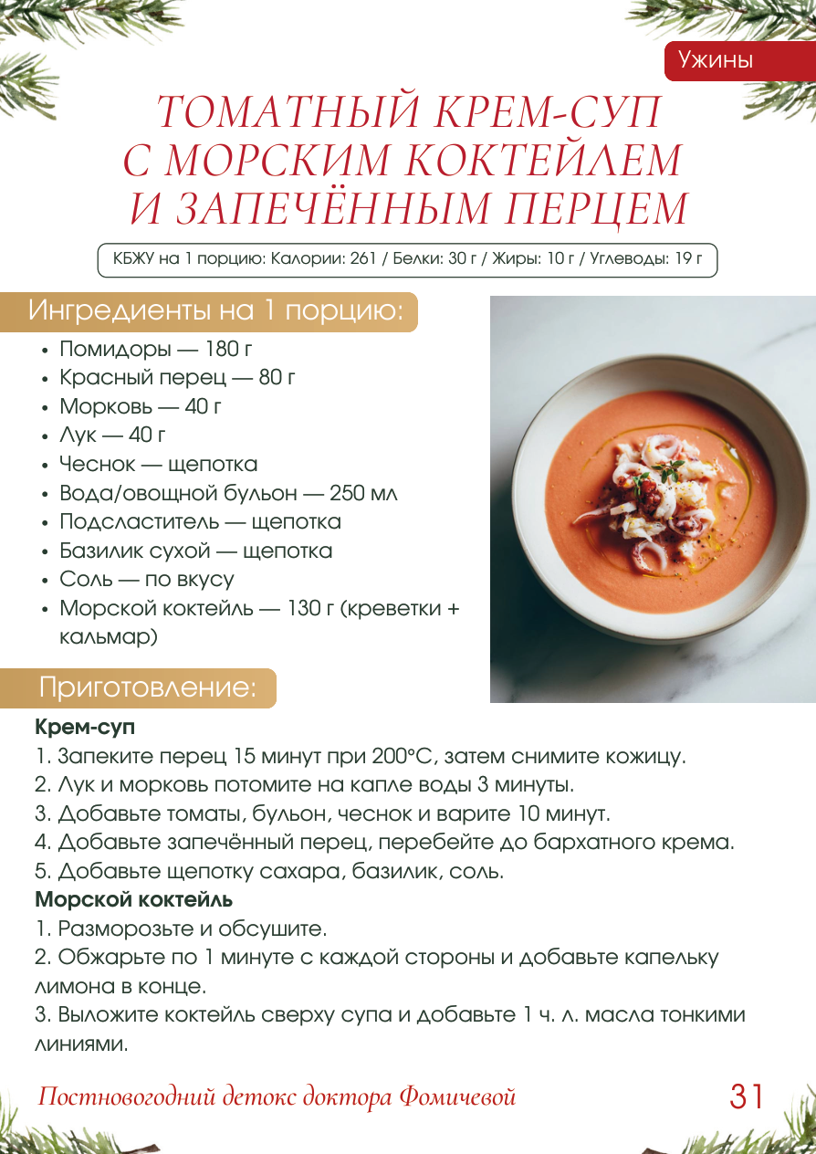 - Выложите коктейль сверху супа и добавьте 1 чл масла тонкими линиями. ТОМАТНЫЙ КРЕМ-СУП С МОРСКИМ КОКТЕЙЛЕМ И ЗАПЕЧЁННЫМ ПЕРЦЕМ 31 Ужины Ингредиенты на 1 порцию: Приготовление: КБЖУ на 1 порцию: Калории: 261 / Белки: 30 г / Жиры: 10 г / Углеводы: 19 г
