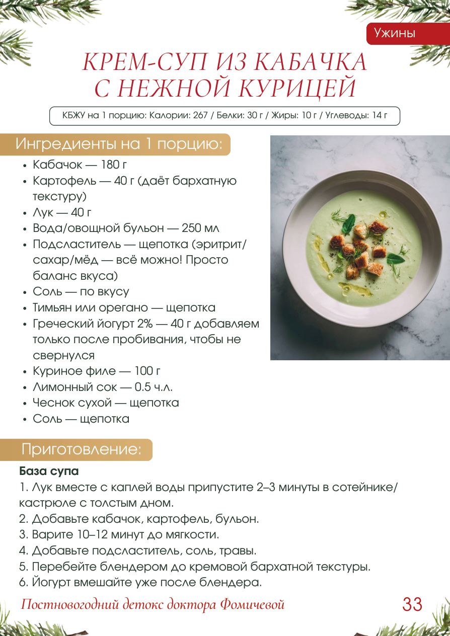 - Йогурт вмешайте уже после блендера. КРЕМ-СУП ИЗ КАБАЧКА С НЕЖНОЙ КУРИЦЕЙ 33 Ужины Ингредиенты на 1 порцию: Приготовление: КБЖУ на 1 порцию: Калории: 267 / Белки: 30 г / Жиры: 10 г / Углеводы: 14 г Курица