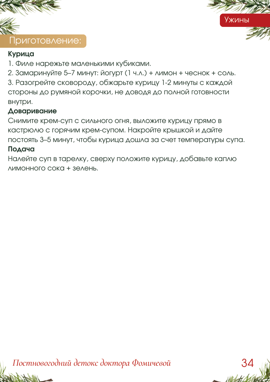 К абачок - 180 г Картофель - 40 г (даёт бархатную текстуру) Лук - 40 г Вода/овощной бульон - 250 мл Подсластитель - щепотка (эритрит/ сахар/мёд - всё можно! Просто баланс вкуса) Соль - по вкусу Тимьян или орегано - щепотка Греческий йогурт 2% - 40 г добавляем только после пробивания, чтобы не свернулся Куриное филе - 100 г Лимонный сок - 0.5 ч.л. Чеснок сухой - щепотка Соль - щепотка База супа 1. Лук вместе с каплей воды припустите 2-3 минуты в сотейнике/ кастрюле с толстым дном. 2. Добавьте кабачок, картофель, бульон. 3. Варите 10-12 минут до мягкости. 4. Добавьте подсластитель, соль, травы. 5. Перебейте блендером до кремовой бархатной тексту ры. 6. Йогурт вмешайте уже после блендера. КРЕМ-СУП ИЗ КАБАЧКА С НЕЖНОЙ КУРИЦЕЙ 33 Ужины Ингредиенты на 1 порцию: Приготовление: КБЖУ на 1 порцию: Калории: 267 / Белки: 30 г / Жиры: 10 г / Углеводы: 14 г Курица 1. Филе нарежьте маленькими кубиками. 2. Замаринуйте 5-7 минут: йогурт (1 ч.л.) + лимон + чеснок + соль. 3. Разогрейте сковороду, обжарьте курицу 1-2 минуты с каждой стороны до румяной корочки, не доводя до полной гот овности внутри. Доваривание Снимите крем-суп с сильного огня, выложите курицу п рямо в кастрюлю с горячим крем-супом. Накройте крышкой ид айте постоять 3-5 минут, чтобы курица дошла за счет темп ературы супа. Подача Налейте суп в тарелку, сверху положите курицу, доба вьте каплю лимонного сока + зелень. Ужины Приготовление: 34