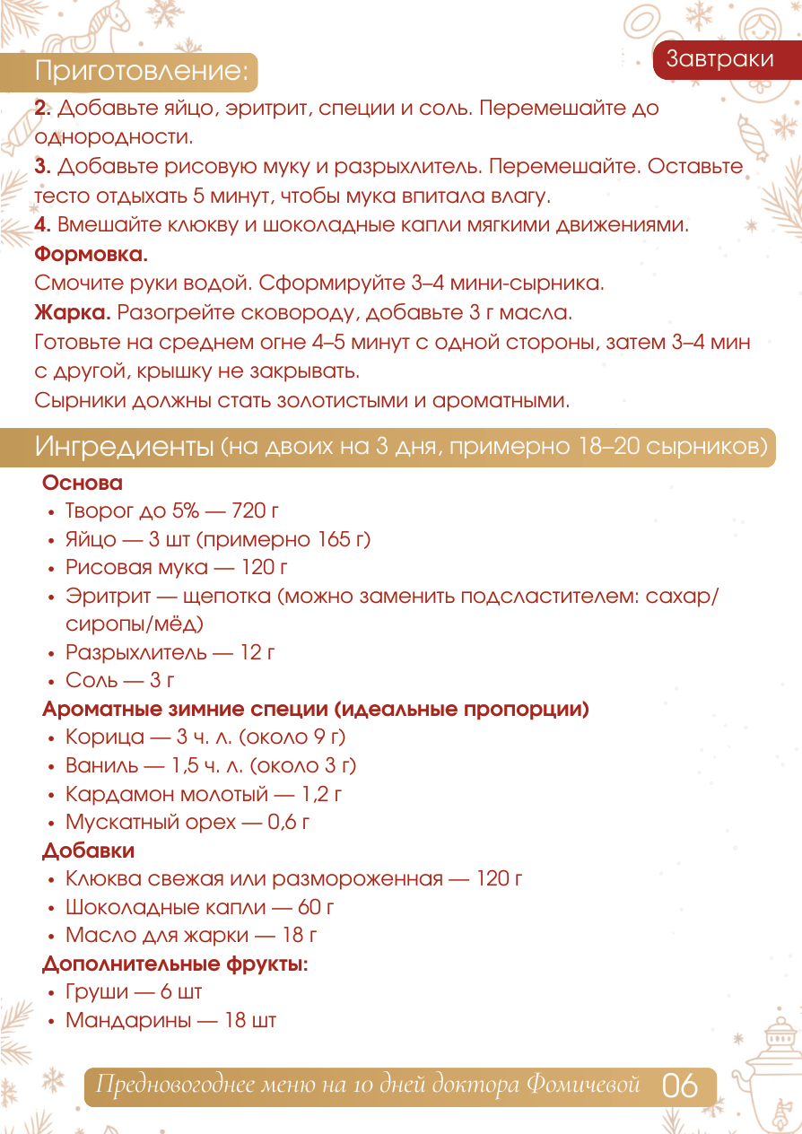 Завтраки СЫРНИКИ С ЗИМНИМИ СПЕЦИЯМИ,КЛЮКВОЙ И ШОКОЛАДНЫМИ КАПЛЯМИ КБЖУ на 1 порцию: Калории: 314 / Белки: 22.8 г / Жиры: 14 г / Углеводы: 25 г Ингредиенты на 1 порцию: Основа - Творог до 5% - 120 г - Яйцо - 1 шт (55 г - Рисовая мука - 20 г - Эритрит - щепотка (можно заменить подсластителем: сахар/сиропы/мёд) - Разрыхлитель - 2 г - Соль - щепотка (0.5 г Ароматные зимние специи (идеальные пропорции) - Корица - 0.5 ч.л. (1.5 г (получается 3-4 - Ваниль - 0.25 ч.л. (0.5 г маленьких сырника) - Кардамон молотый - 1 щепотка (0.2 г - Мускатный орех - на кончике ножа (0.1 г Добавки - Клюква свежая или размороженная - 20 г - Шоколадные капли - 10 г - Масло для жарки - 3 г (1/3 ч.л.) К порции добавить: - Груша - 1 шт - Мандарины - 3 шт Приготовление: Подготовка массы 1. Перетрите творог вилкой 20-30 секунд, чтобы масса стала более гладкой. Приготовление: 2. Добавьте яйцо, эритрит, специи и соль. Перемешайте до однородности. 3. Добавьте рисовую муку и разрыхлитель. Перемешайте. Оставьте тесто отдыхать 5 минут, чтобы мука впитала влагу. 4. Вмешайте клюкву и шоколадные капли мягкими движения ми. Формов ка. Смочите руки водой. Сформируйте 3-4 мини-сырника. Жарка. Разогрейте сковороду, добавьте 3 г масла. Готовьте на среднем огне 4-5 минут с одной стороны, затем 3-4 мин с другой, крышку не закрывать. Сырники должны стать золотистыми и ароматными. Основа Творог до 5% - 720 г Яйцо - 3 шт (примерно 165 г Рисовая мука - 120 г Э ритрит - щепотка (можно заменить подсластителем: са хар/ сиропы/мёд) Разрыхлитель - 12 г Соль - 3 г Ароматные зимние специи (идеальные пропорции) Корица - 3 чл (около 9 г В аниль - 1,5 чл (около 3 г Кардамон молотый - 1,2 г Мускатный орех - 0,6 г Добавки Клюква свежая или размороженная - 120 г Шоколадные капли - 60 г Масло для жарки - 18 г Дополнительные фрукты: Груши - 6 шт Мандарины - 18 шт (на двоих на 3 дня, примерно 18-20 сырников)Ингредиенты Завтраки 06