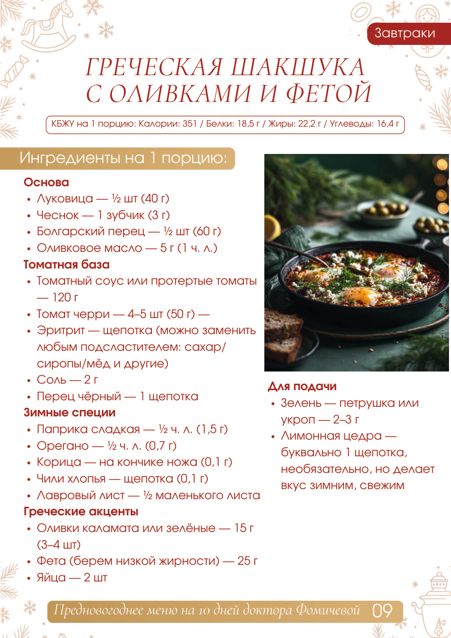 Завтраки ГРЕЧЕСКАЯ ШАКШУКА С ОЛИВКАМИ И ФЕТОЙ КБЖУ на 1 порцию: Калории: 351 / Белки: 18,5 г / Жиры: 22,2 г / Углеводы: 16,4 г Ингредиенты на 1 порцию: Основа - Луковица - ½ шт (40 г - Чеснок - 1 зубчик (3 г - Болгарский перец - ½ шт (60 г - Оливковое масло - 5 г (1 чл Томатная база - Томатный соус или протертые томаты - 120 г - Томат черри - 4-5 шт (50 г - - Эритрит - щепотка (можно заменить любым подсластителем: сахар/ сиропы/мёд и другие) - Соль - 2 г Для подачи - Перец чёрный - 1 щепотка - Зелень - петрушка или Зимные специи укроп - 2-3 г - Паприка сладкая - ½ чл (1,5 г - Лимонная цедра - - Орегано - ½ чл (0,7 г буквально 1 щепотка, - Корица - на кончике ножа (0,1 г необязательно, но делает - Чили хлопья - щепотка (0,1 г вкус зимним, свежим - Лавровый лист - ½ маленького листа Греческие акценты - Оливки каламата или зелёные - 15 г (3-4 шт) - Фета (берем низкой жирности) - 25 г - Яйца - 2 шт Завтраки Приготовление: 1. Овощи. Разогрейте сковороду. Добавьте 5 г масла. Тушите лук 2 минуты. Добавьте чеснок, перец и жарьте ещё 6-7 минут на среднем огне. 2. Томатная база. Добавьте томатный соус, черри, эритрит, соль, специи, лавровый лист. Тушите 10 минут на тихом огне без крышки. Соус должен стать густым и слегка сладковатым. 3. Яйца. Сделайте два углубления в соусе. Вбейте яйца. Закройте крышку. Готовьте 5-6 минут на минимальном огне, чтобы желток остался мягким. 4. Греческий финал! Добавьте оливки, фету крошкой, зелень и щепотку лимонной цедры. Отключите огонь и дайте постоять 1 минуту. Ингредиенты (на двоих на 3 дня, примерно 6 порций) Основа Зимние специи - Лук - 3 шт (240 г - Паприка - 3 чл (9 г - Чеснок - 6 зубчиков (18 г - Орегано - 3 чл (4-5 г - Болгарский перец - 3 шт (360 г - Корица - 0,6 г - Оливковое масло - 30 г - Чили - 0,6 г Томатная база Греческие акценты - Томатный соус - 720 г - Оливки - 90 г - Томат черри - 300 г - Фета - 150 г - Эритрит - щепотка - Яйца - 12 шт (по 2 на порцию) - Соль - 12 г Подача - Перец - по вкусу - Зелень - 10-12 г - Лавровый лист - 3 маленьких - Лимонная цедра - 1,5 г