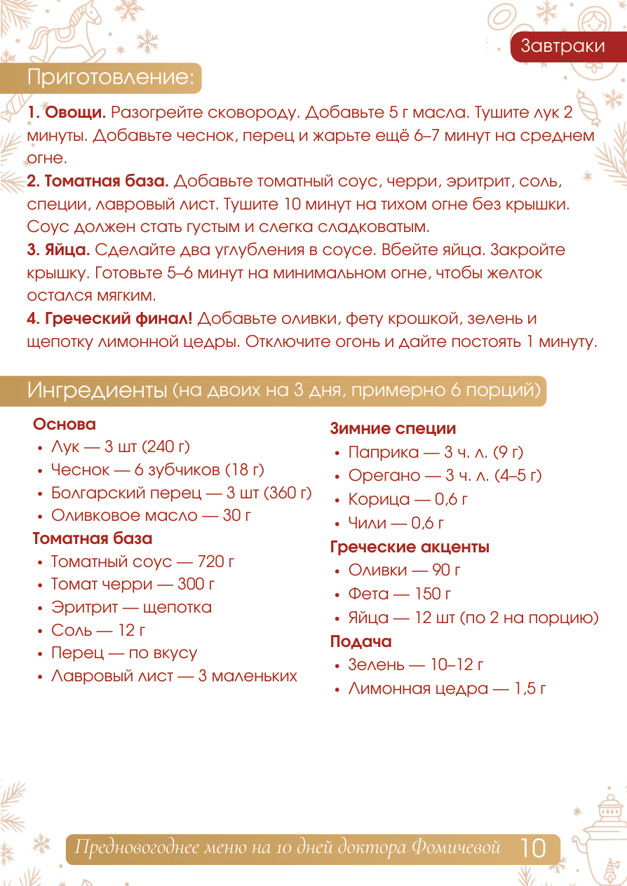 - Греческий финал! Добавьте оливки, фету крошкой, зелень и щепотку лимонной цедры. Отключите огонь и дайте постоять 1 минуту. Ингредиенты (на двоих на 3 дня, примерно 6 порций) Основа Зимние специи - Лук - 3 шт (240 г - Паприка - 3 чл (9 г - Чеснок - 6 зубчиков (18 г - Орегано - 3 чл (4-5 г - Болгарский перец - 3 шт (360 г - Корица - 0,6 г - Оливковое масло - 30 г - Чили - 0,6 г Томатная база Греческие акценты - Томатный соус - 720 г - Оливки - 90 г - Томат черри - 300 г - Фета - 150 г - Эритрит - щепотка - Яйца - 12 шт (по 2 на порцию) - Соль - 12 г Подача - Перец - по вкусу - Зелень - 10-12 г - Лавровый лист - 3 маленьких - Лимонная цедра - 1,5 г