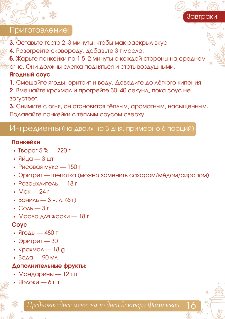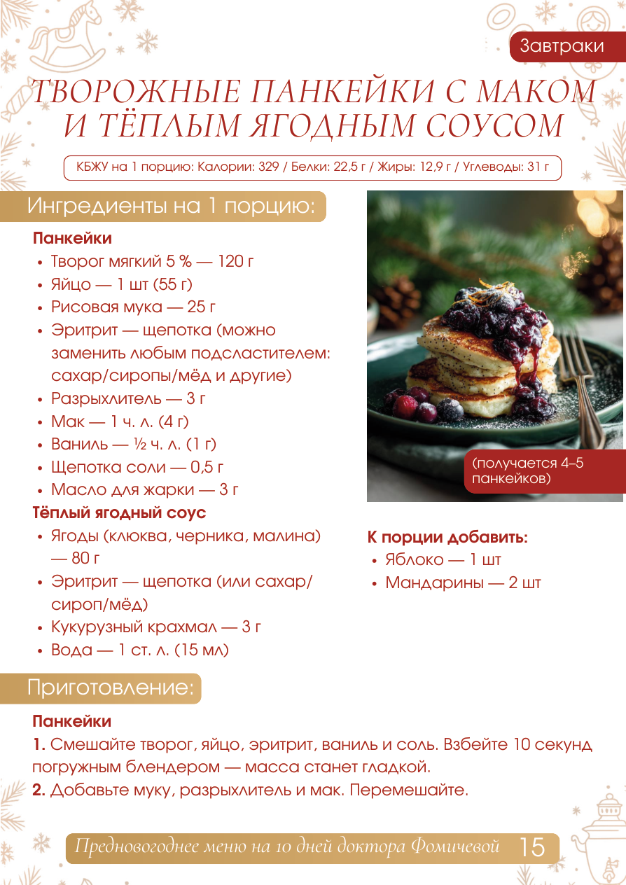 Завтраки ТВОРОЖНЫЕ ПАНКЕЙКИ С МАКОМ И ТЁПЛЫМ ЯГОДНЫМ СОУСОМ КБЖУ на 1 порцию: Калории: 329 / Белки: 22,5 г / Жиры: 12,9 г / Углеводы: 31 г Ингредиенты на 1 порцию: Панкейки - Творог мягкий 5 % - 120 г - Яйцо - 1 шт (55 г - Рисовая мука - 25 г - Эритрит - щепотка (можно заменить любым подсластителем: сахар/сиропы/мёд и другие) - Разрыхлитель - 3 г - Мак - 1 чл (4 г - Ваниль - ½ чл (1 г - Щепотка соли - 0,5 г панкейков) (получается 4-5 - Масло для жарки - 3 г Тёплый ягодный соус - Ягоды (клюква, черника, малина) К порции добавить: - 80 г - Яблоко - 1 шт - Эритрит - щепотка (или сахар/ - Мандарины - 2 шт сироп/мёд) - Кукурузный крахмал - 3 г - Вода - 1 ст. л (15 мл) Приготовление: Панкейки 1. Смешайте творог, яйцо, эритрит, ваниль и соль. Взбейте 10 секунд погружным блендером - масса станет гладкой. 2. Добавьте муку, разрыхлитель и мак. Перемешайте. Завтраки Приготовление: 3. Оставьте тесто 2-3 минуты, чтобы мак раскрыл вкус. 4. Разогр ейте сково роду, добавьте 3 г масла. 5. Жарьте панкейки по 1,5-2 минуты с каждой стороны на сре днем огне . Они должны слегка подняться и стать воздушными. Ягодный с оус 1. С мешайте яг оды, эритрит и воду. Доведите до лёгкого кипения. 2. Вмешайте крахмал и прогрейте 30-40 секунд, пока соу с не загустеет. 3. Снимите с огня, он становится тёплым, ароматным, насыщенным . Подавайте панкейки с тёплым соусом сверху. (на двоих на 3 дня, примерно 6 порций)Ингредиенты Панкейки Творог 5 % - 720 г Яйца - 3 шт Рисовая мука - 150 г Эритрит - щепотка (можно заменить сахаром/мёдом/сир опом) Разрыхлитель - 18 г Мак - 24 г Ваниль - 3 чл (6 г Соль - 3 г Масло для жарки - 18 г Соус Яг оды - 480 г Эритрит - 30 г Крахмал - 18 g Вода - 90 мл Дополнительные фрукты: Мандарины - 12 шт Яблоки - 6 шт 16