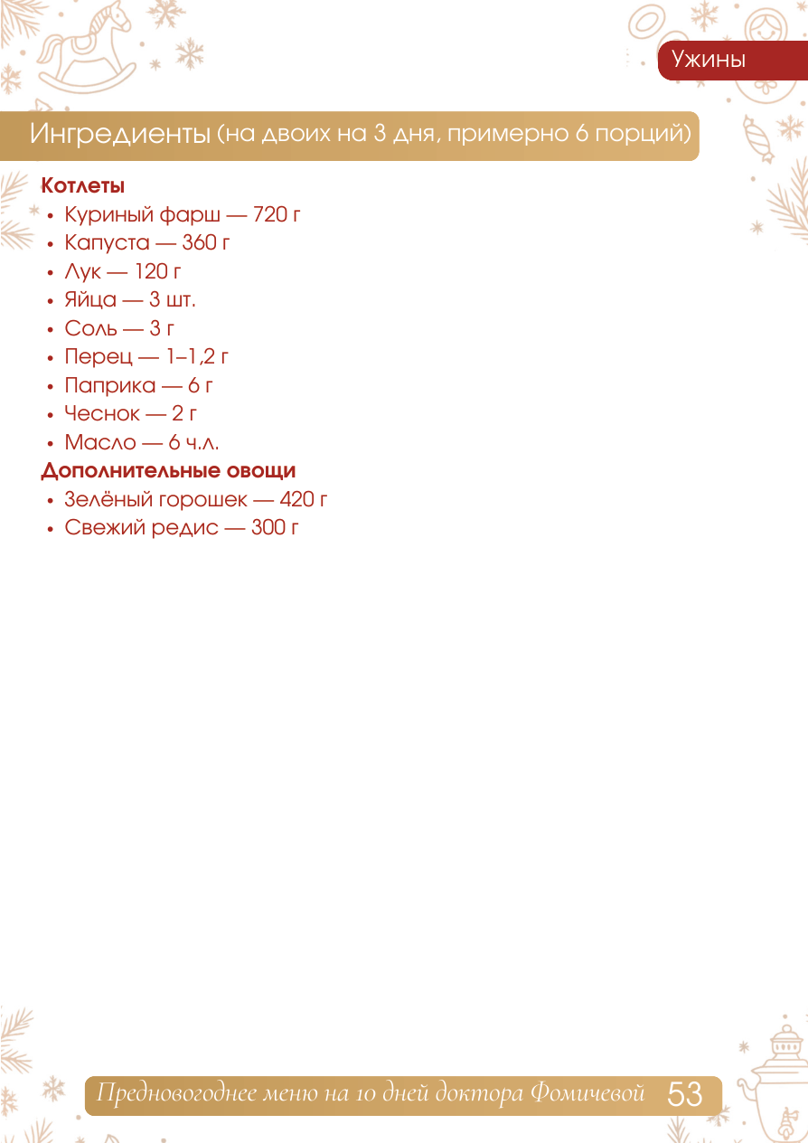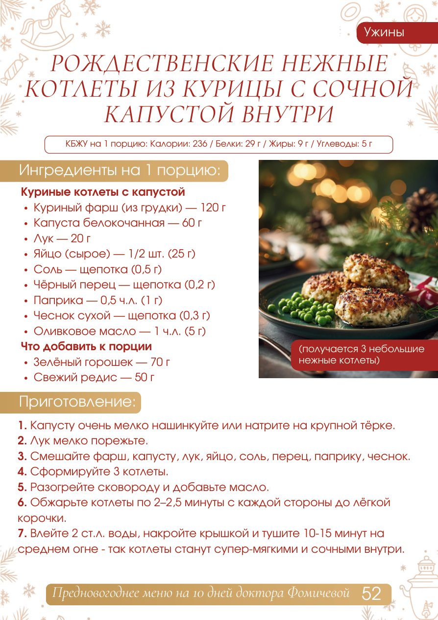 Ужины Ингредиенты на 1 порцию: РОЖДЕСТВЕНСКИЕ НЕЖНЫЕ КОТЛЕТЫ ИЗ КУРИЦЫ С СОЧНОЙ КАПУСТОЙ ВНУТРИ 52 КБЖУ на 1 порцию: Калории: 236 / Белки: 29 г / Жиры: 9 г / Углеводы: 5 г Куриные котлеты с капустой Куриный ф арш (из грудки) - 120 г Капуста белокочанная - 60 г Лук - 20 г Яйцо (сырое) - 1/2 шт. (25 г Соль - щепотка (0,5 г Чёрный перец - щепотка (0,2 г Паприка - 0,5 ч.л. (1 г Чеснок сухой - щепотка (0,3 г Оливковое масло - 1 ч.л. (5 г Что добавить к порции Зелёный горошек - 70 г Свежий редис - 50 г (получается 3 небольшие нежные котлеты) 1. Капусту очень мелко нашинкуйте или натрите на круп ной тёрке. 2. Лук мелко порежьте. 3. Смешайте фарш, капусту, лук, яйцо, соль, перец, па прику, чеснок. 4. Сформируйте 3 котлеты. 5. Разогрейте сковороду и добавьте масло. 6. Обжарьте котлеты по 2-2,5 минуты с каждой стороны до лёгкой корочки. 7. Влейте 2 ст.л. воды, накройте крышкой и тушите 10- 15 минут на среднем огне - так котлеты станут супер-мягкими ис очными внутри. Приготовление: Ужины Ингредиенты (на двоих на 3 дня, примерно 6 порций) Котлеты - Куриный фарш - 720 г - Капуста - 360 г - Лук - 120 г - Яйца - 3 шт. - Соль - 3 г - Перец - 1-1,2 г - Паприка - 6 г - Чеснок - 2 г - Масло - 6 ч.л. Дополнительные овощи - Зелёный горошек - 420 г - Свежий редис - 300 г