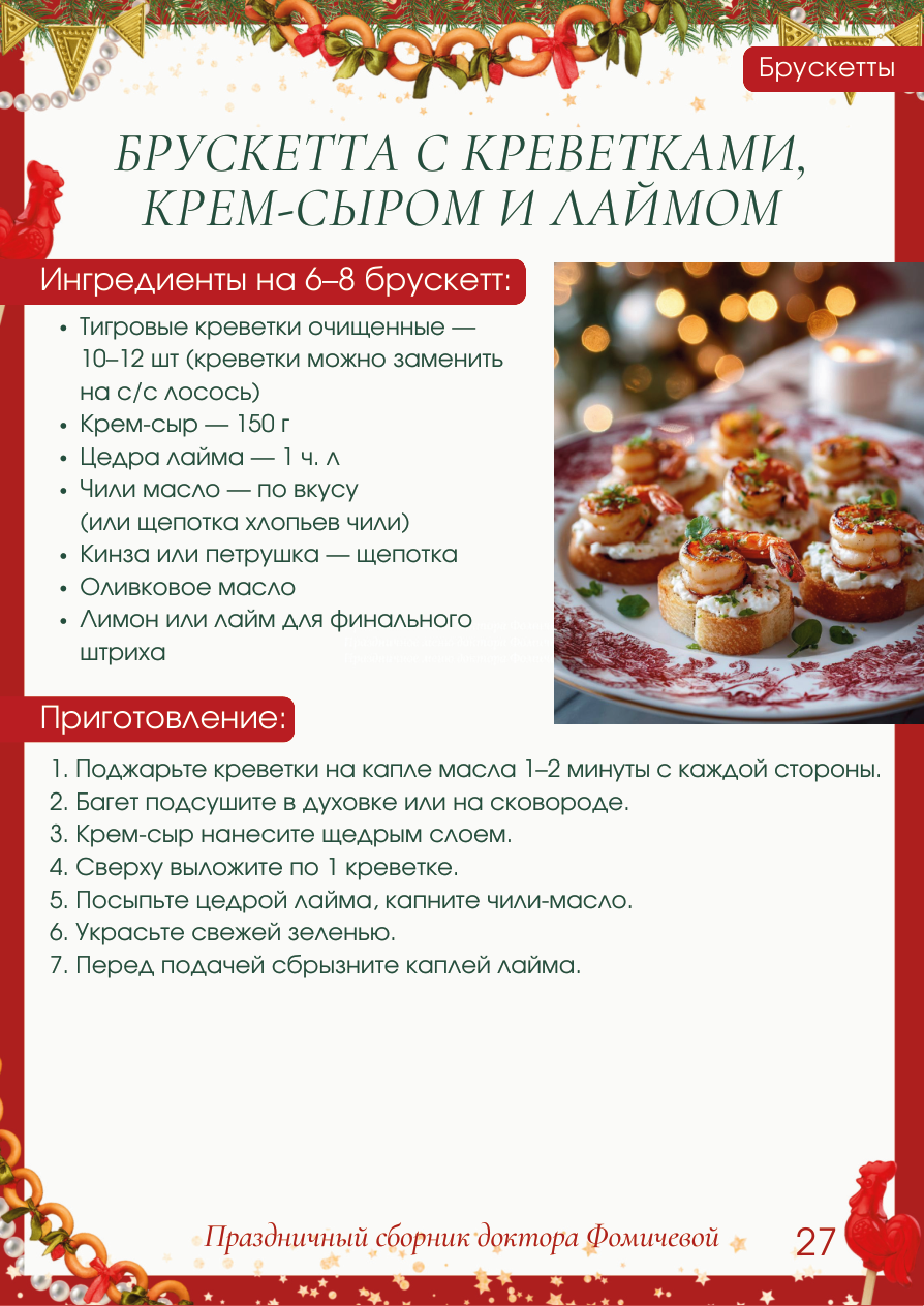 Ингредиенты на 6-8 брускетт: БРУСКЕТТА С КРЕВЕТКАМИ, КРЕМ-СЫРОМ И ЛАЙМОМ 27 Тигровые креветки очищенные - 10-12 шт (креветки можно заменить на с/с лосось) Крем-сыр - 150 г Цедра лайма - 1 чл Чили масло - по вкусу (или щепотка хлопьев чили) Кинза или петрушка - щепотка Оливковое масло Лимон или лайм для финального штриха 1. Поджарьте креве тки на капле масла 1-2 минуты с каждой стороны. 2. Багет подсушите в духовке или на сковороде. 3. Крем-сыр нанесите щедрым слоем. 4. Сверху выложите по 1 креветке. 5. Посыпьте цедрой лайма, капните чили-масло. 6. Украсьте свежей зеленью. 7. Перед подачей сбрызните каплей лайма. Приготовление: Брускетты
