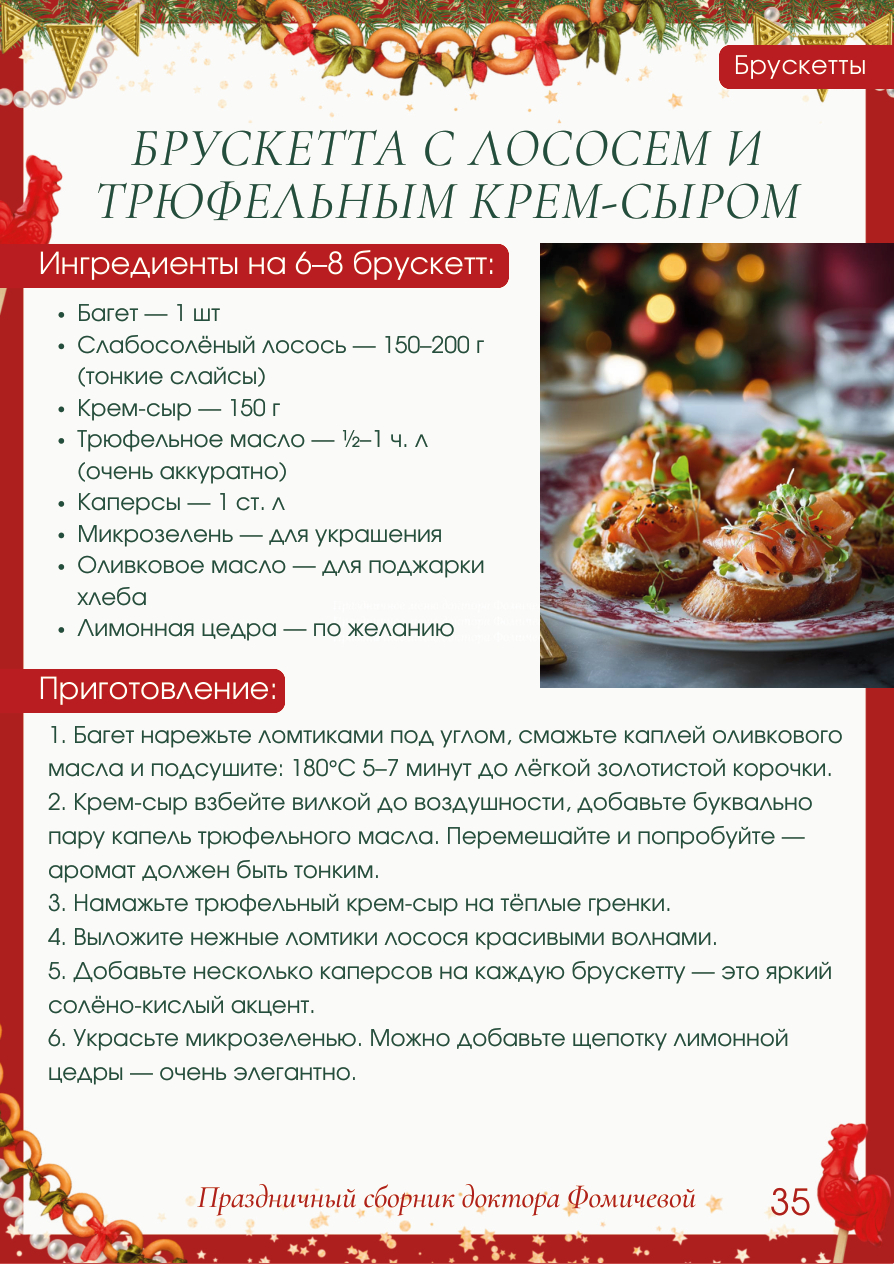 Ингредиенты на 6-8 брускетт: БРУСКЕТТА С ЛОСОСЕМ И ТРЮФЕЛЬНЫМ КРЕМ-СЫРОМ 35 Багет - 1 шт Слабосолёный лосось - 150-200 г т онкие слайсы) Крем-сыр - 150 г Трюфельное масло - ½-1 чл (очень аккуратно) Каперсы - 1 ст. л Микрозелень - для украшения Оливковое масло - для поджарки хлеба Лимонная цедра - по желанию 1. Багет нарежьте ломтиками под углом, смажьте каплей оливк ового масла и подсушите: C 5-7 минут до лёгкой золоти стой корочки. 2. Крем-сыр взбейте вилкой до воздушности, добавьте буквально пару капель трюфельного масла. Перемешайте и попроб уйте - аромат должен быть тонким. 3. Намажьте трюфельный крем-сыр на тёплые гренки. 4. Выложите нежные ломтики лосося красивыми волнами . 5. Добавьте несколько каперсов на каждую брускетту - это яркий солёно-кислый акцент. 6. Украсьте микрозеленью. Можно добавьте щепотку ли монной цедры - очень элегантно. Приготовление: Брускетты