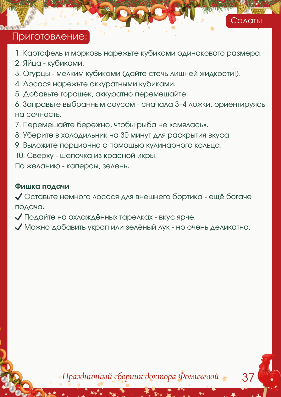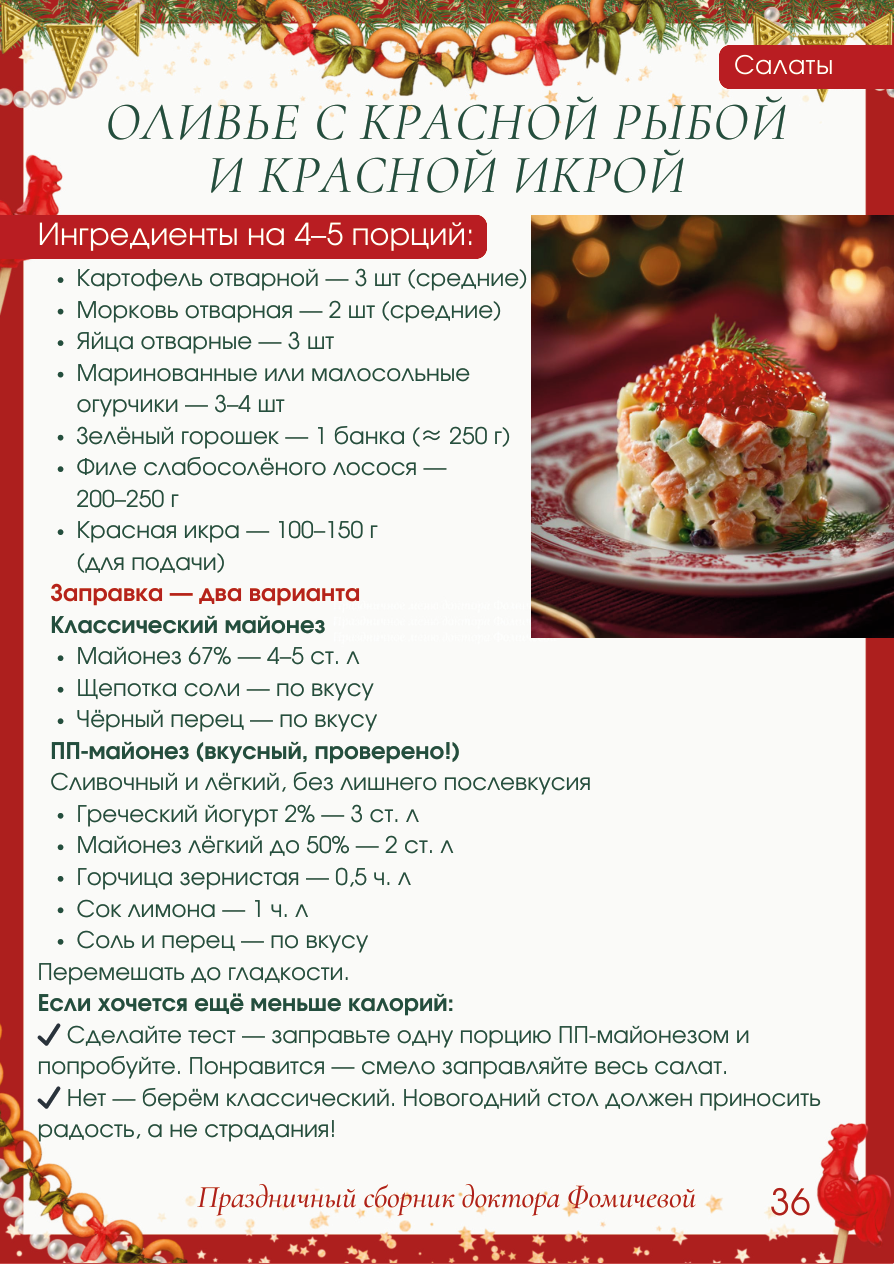 Ингредиенты на 4-5 порций: ОЛИВЬЕ С КРАСНОЙ РЫБОЙ И КРАСНОЙ ИКРОЙ 36 Картофель отварной - 3 шт (средние) Мо рковь отварная - 2 шт (средние) Яйца отварные - 3 шт Ма ринованные или м алосольные огурчики - 3-4 шт Зелёный горошек - 1 б анка ( ≈ 250 г Филе слабосолёного лосося - 200-250 г Кр асная икра - 100-150 г (для подачи) Заправка - два варианта Классический майонез Майонез 67% - 4-5 ст. л Щепотка соли - по вкусу Чёрный перец - по вкусу ПП-майонез (вкусный, проверено!) Сливочный и лёгкий, без лишнего послевкусия Греческий йогурт 2% - 3 ст. л Майонез лёгкий до 50% - 2 ст. л Горчица зернистая - 0,5 чл Сок лимона - 1 чл Соль и перец - по вкусу Перемешать до гладкости. Если хочется ещё меньше калорий: ✔ Сделайте тест - заправьте одну порцию ПП-майонезом и попробуйте. Понравится - смело заправляйте весь сал ат. ✔ Нет - берём классический. Новогодний стол должен пр иносить радость, а не страдания! Салаты 37 1. Картофель и морковь нарежьте кубиками одинаковог о размера. 2. Яйца - кубиками. 3. Огурцы - мелким кубиками (дайте стечь лишней жид кости!). 4. Лосося нарежьте аккуратными кубиками. 5. Добавьте горошек, аккуратно перемешайте. 6. Заправьте выбранным соусом - сначала 3-4 ложки, ориентируясь на сочность. 7. Перемешайте бережно, чтобы рыба не «смялась». 8. Уберите в холодильник на 30 минут для раскрытия вкуса. 9. Выложите порционно с помощью кулинарного кольца. 10. Сверху - шапочка из красной икры. По желанию - каперсы, зелень. Фишка подачи ✔ Оставьте немного лосося для внешнего бортика - ещё богаче подача. ✔ Подайте на охлаждённых тарелках - вкус ярче. ✔ Можно добавить укроп или зелёный лук - но очень де ликатно. Приготовление: Салаты