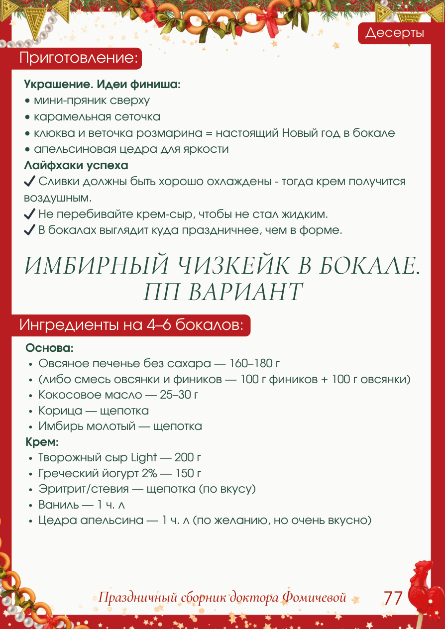 77 Украшение. Идеи финиша: Ҁ мини-пряник сверху Ҁ карамельная сеточка Ҁ клюква и веточка розмарина = настоящий Новый год в бокале Ҁ апельсиновая цедра для яркости Лайфхаки успеха ✔ Сливки должны быть хорошо охлаждены - тогда крем п олучится воздушным. ✔ Не перебивайте крем-сыр, чтобы не стал жидким. ✔ В бокалах выглядит куда праздничнее, чем в форме. Приготовление: Десерты Ингредиенты на 4-6 бокалов: ИМБИРНЫЙ ЧИЗКЕЙК В БОКАЛЕ. ПП ВАРИАНТ Основа: Овсяное печенье без сахара - 160-180 г ( либо смесь овсянки и фиников - 100 г фиников + 100 г овсянки) Кокосовое масло - 25-30 г Корица - щепотка Имбирь молотый - щепотка Крем: Творожный сыр Light - 200 г Греческий йогурт 2% - 150 г Э ритрит/стевия - щепотка (по вкусу) В аниль - 1 чл Цедра апе льсина - 1 чл (по желанию, но очен ь вкусно) 78 Основа Измельчите печенье в крошку. Смешайте с растопленным кокосовым маслом, корицей, имбирём. Выложите в бокалы первым слоем, слегка прижмите. Крем Смешайте творожный сыр, йогурт, подсластитель, вани ль. Взбейте до гладкости 20-30 секунд. Добавьте цедру - это вау-аромат! Консистенция должна быть кремовой и устойчивой. Если жидковато - добавьте 1-2 чл сухого молока ил и протеина на ванили. Сборка Слои: крошка - крем - крошка - крем. Охлаждение Минимум 1 час в холодильнике. Лайфхаки успеха ✔ Йогурт - густой (иначе крем станет жидким). ✔ Имбирь + цедра = вкус полноценного имбирного печен ья. Приготовление: Десерты