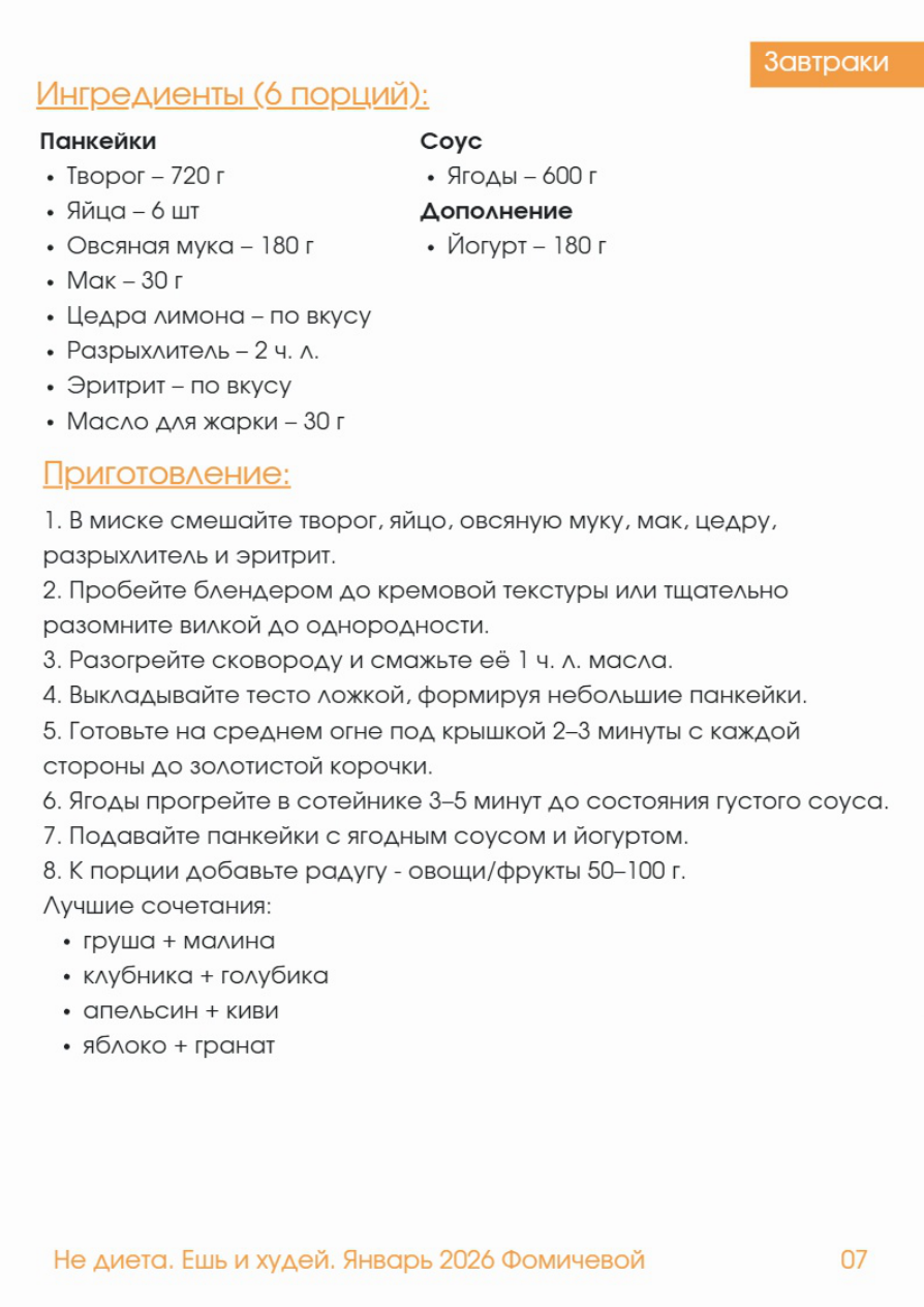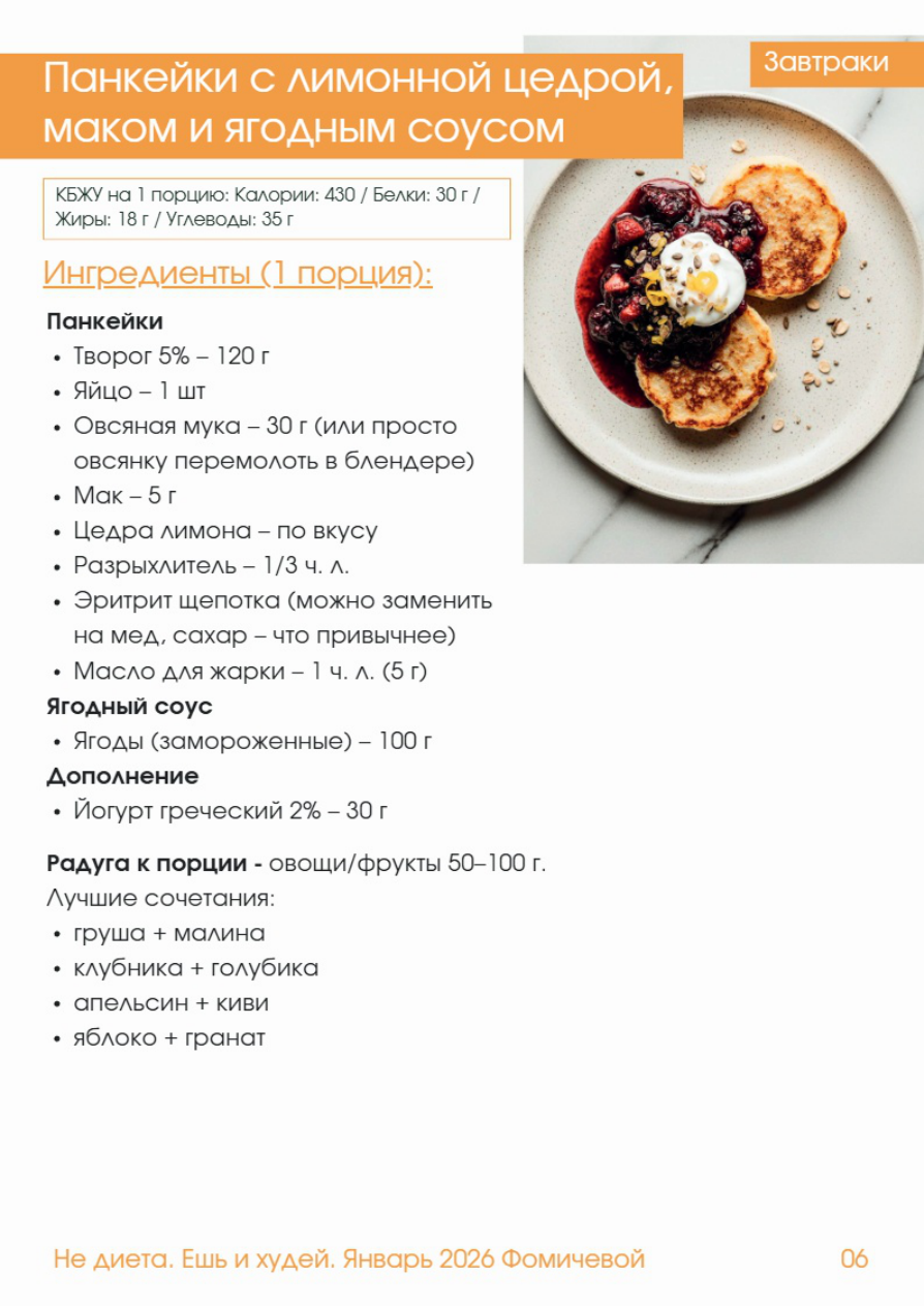 Панкейки с лимонной цедрой, Завтраки маком и ягодным соусом КБЖУ на 1 порцию: Калории: 430 / Белки: 30 г / Жиры: 18 г / Углеводы: 35 г Ингредиенты (1 порция): Панкейки - Творог 5% - 120 г - Яйцо - 1 шт - Овсяная мука - 30 г (или просто овсянку перемолоть в блендере) - Мак - 5 г - Цедра лимона - по вкусу - Разрыхлитель - 1/3 чл - Эритрит щепотка (можно заменить на мед, сахар - что привычнее) - Масло для жарки - 1 чл (5 г Ягодный соус - Ягоды (замороженные) - 100 г Дополнение - Йогурт греческий 2% - 30 г Радуга к порции - овощи/фрукты 50-100 г Лучшие сочетания: - груша + малина - клубника + голубика - апельсин + киви - яблоко + гранат Завтраки Ингредиенты (6 порций): Панкейки Соус - Творог - 720 г - Ягоды - 600 г - Яйца - 6 шт Дополнение - Овсяная мука - 180 г - Йогурт - 180 г - Мак - 30 г - Цедра лимона - по вкусу - Разрыхлитель - 2 чл - Эритрит - по вкусу - Масло для жарки - 30 г Приготовление: 1. В миске смешайте творог, яйцо, овсяную муку, мак, цедру, разрыхлитель и эритрит. 2. Пробейте блендером до кремовой текстуры или тщательно разомните вилкой до однородности. 3. Разогрейте сковороду и смажьте её 1 чл масла. 4. Выкладывайте тесто ложкой, формируя небольшие панкейки. 5. Готовьте на среднем огне под крышкой 2-3 минуты с каждой стороны до золотистой корочки. 6. Ягоды прогрейте в сотейнике 3-5 минут до состояния густого соуса. 7. Подавайте панкейки с ягодным соусом и йогуртом. 8. К порции добавьте радугу - овощи/фрукты 50-100 г Лучшие сочетания: - груша + малина - клубника + голубика - апельсин + киви - яблоко + гранат