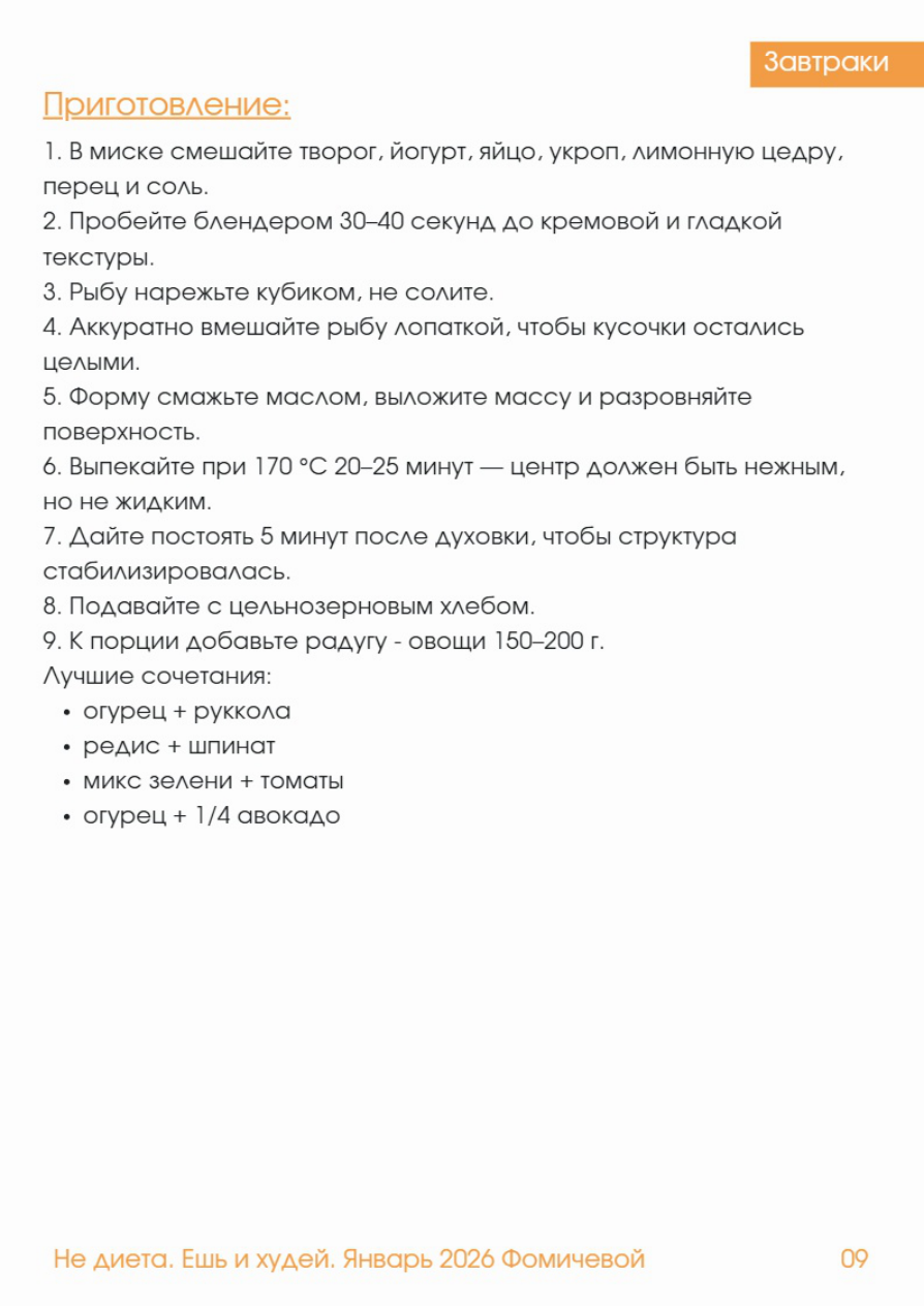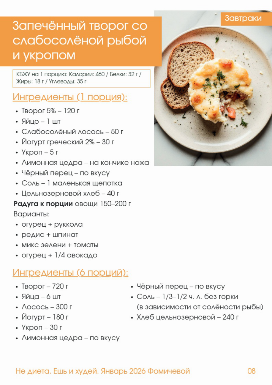 Запечённый творог со Завтраки слабосолёной рыбой и укропом КБЖУ на 1 порцию: Калории: 460 / Белки: 32 г / Жиры: 18 г / Углеводы: 35 г Ингредиенты (1 порция): - Творог 5% - 120 г - Яйцо - 1 шт - Слабосолёный лосось - 50 г - Йогурт греческий 2% - 30 г - Укроп - 5 г - Лимонная цедра - на кончике ножа - Чёрный перец - по вкусу - Соль - 1 маленькая щепотка - Цельнозерновой хлеб - 40 г Радуга к порции овощи 150-200 г Варианты: - огурец + руккола - редис + шпинат - микс зелени + томаты - огурец + 1/4 авокадо Ингредиенты (6 порций): - Творог - 720 г - Чёрный перец - по вкусу - Яйца - 6 шт - Соль - 1/3-1/2 чл без горки - Лосось - 300 гв зависимости от солёности рыбы) - Йогурт - 180 г - Хлеб цельнозерновой - 240 г - Укроп - 30 г - Лимонная цедра - по вкусу Завтраки Приготовление: 1. В миске смешайте творог, йогурт, яйцо, укроп, лимонную цедру, перец и соль. 2. Пробейте блендером 30-40 секунд до кремовой и гладкой текстуры. 3. Рыбу нарежьте кубиком, не солите. 4. Аккуратно вмешайте рыбу лопаткой, чтобы кусочки остались целыми. 5. Форму смажьте маслом, выложите массу и разровняйте поверхность. 6. Выпекайте при 170 C 20-25 минут - центр должен быть нежным, но не жидким. 7. Дайте постоять 5 минут после духовки, чтобы структура стабилизировалась. 8. Подавайте с цельнозерновым хлебом. 9. К порции добавьте радугу - овощи 150-200 г Лучшие сочетания: - огурец + руккола - редис + шпинат - микс зелени + томаты - огурец + 1/4 авокадо Не диета. Ешь 1 худей. Январь 202