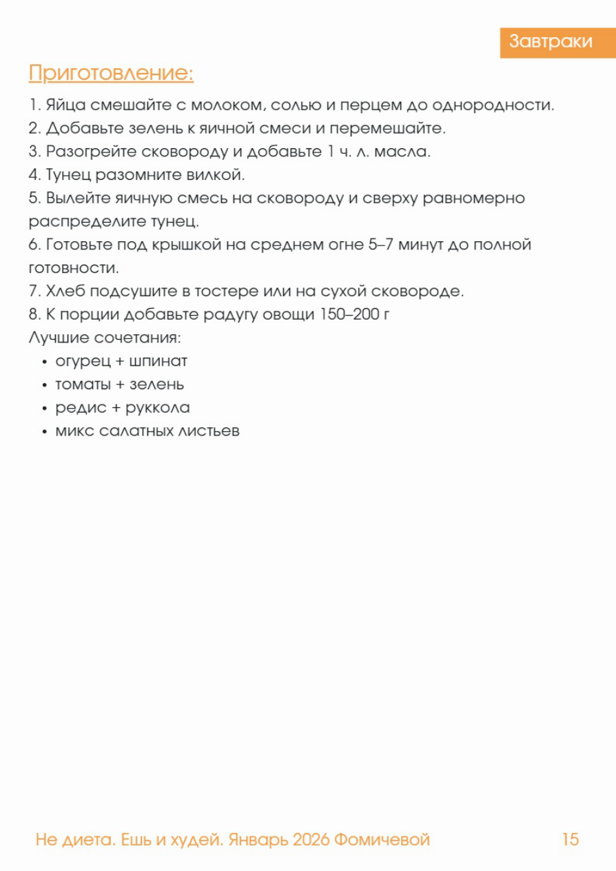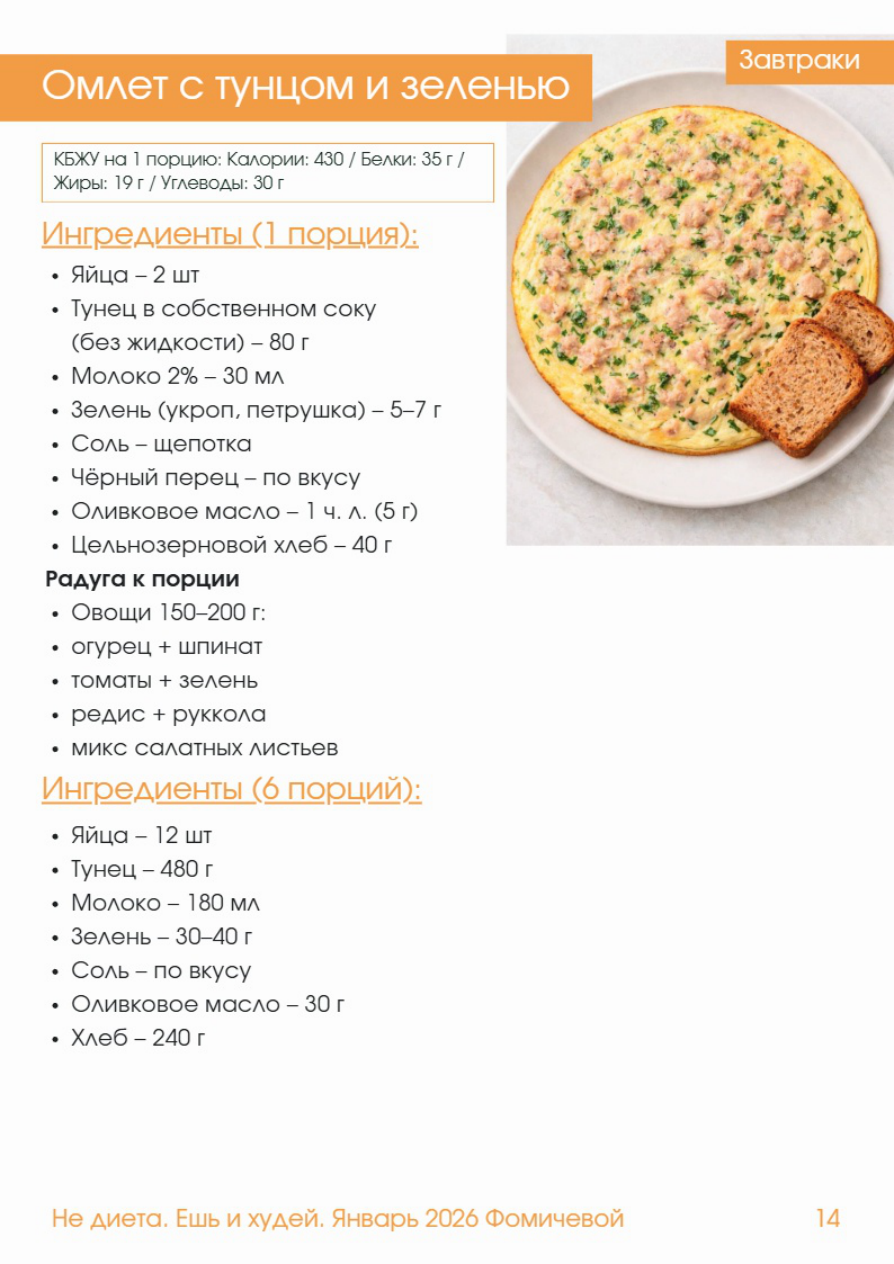 Омлет с тунцом и зеленью Завтраки КБЖУ на 1 порцию: Калории: 430 / Белки: 35 г / Жиры: 19 г / Углеводы: 30 г Ингредиенты (1 порция): - Яйца - 2 шт - Тунец в собственном соку (без жидкости) - 80 г - Молоко 2% - 30 мл - Зелень (укроп, петрушка) - 5-7 г - Соль - щепотка - Чёрный перец - по вкусу - Оливковое масло - 1 чл (5 г - Цельнозерновой хлеб - 40 г Радуга к порции - Овощи 150-200 г - огурец + шпинат - томаты + зелень - редис + руккола - микс салатных листьев Ингредиенты (6 порций): - Яйца - 12 шт - Тунец - 480 г - Молоко - 180 мл - Зелень - 30-40 г - Соль - по вкусу - Оливковое масло - 30 г - Хлеб - 240 г Завтраки Приготовление: 1. Яйца смешайте с молоком, солью и перцем до однородности. 2. Добавьте зелень к яичной смеси и перемешайте. 3. Разогрейте сковороду и добавьте 1 чл масла. 4. Тунец разомните вилкой. 5. Вылейте яичную смесь на сковороду и сверху равномерно распределите тунец. 6. Готовьте под крышкой на среднем огне 5-7 минут до полной готовности. 7. Хлеб подсушите в тостере или на сухой сковороде. 8. К порции добавьте радугу овощи 150-200 г Лучшие сочетания: - огурец + шпинат - томаты + зелень - редис + руккола - микс салатных листьев Не диета. Ешь 1 худей. Январь 202