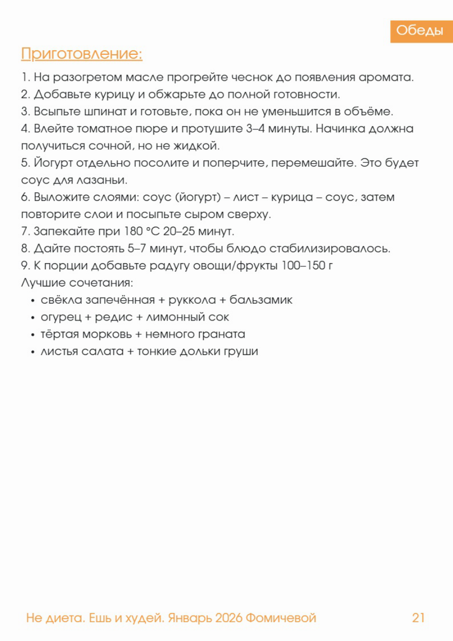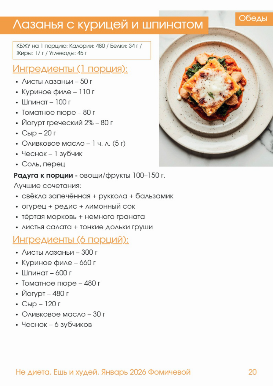 Лазанья с курицей и шпинатом Обеды КБЖУ на 1 порцию: Калории: 480 / Белки: 34 г / Жиры: 17 г / Углеводы: 45 г Ингредиенты (1 порция); - Листы лазаньи - 50 г - Куриное филе - 110 г - Шпинат - 100 г - Томатное пюре - 80 г - Йогурт греческий 2% - 80 г - Сыр - 20 г - Оливковое масло - 1 чл (5 г - Чеснок - 1 зубчик - Соль, перец Радуга к порции - овощи/фрукты 100-150 г Лучшие сочетания: - свёкла запечённая + руккола + бальзамик - огурец + редис + лимонный сок - тёртая морковь + немного граната - листья салата + тонкие дольки груши Ингредиенты (6 порций): - Листы лазаньи - 300 г - Куриное филе - 660 г - Шпинат - 600 г - Томатное пюре - 480 г - Йогурт - 480 г - Сыр - 120 г - Оливковое масло - 30 г - Чеснок - 6 зубчиков Обеды Приготовление: 1. На разогретом масле прогрейте чеснок до появления аромата. 2. Добавьте курицу и обжарьте до полной готовности. 3. Всыпьте шпинат и готовьте, пока он не уменьшится в объёме. 4. Влейте томатное пюре и протушите 3-4 минуты. Начинка должна получиться сочной, но не жидкой. 5. Йогурт отдельно посолите и поперчите, перемешайте. Это будет соус для лазаньи. 6. Выложите слоями: соус (йогурт) - лист - курица - соус, затем повторите слои и посыпьте сыром сверху. 7. Запекайте при 180 С 20-25 минут. 8. Дайте постоять 5-7 минут, чтобы блюдо стабилизировалось. 9. К порции добавьте радугу овощи/фрукты 100-150 г Лучшие сочетания: - свёкла запечённая + руккола + бальзамик - огурец + редис + лимонный сок - тёртая морковь + немного граната - листья салата + тонкие дольки груши Не диета. Ешь 1 худей. Январь 202
