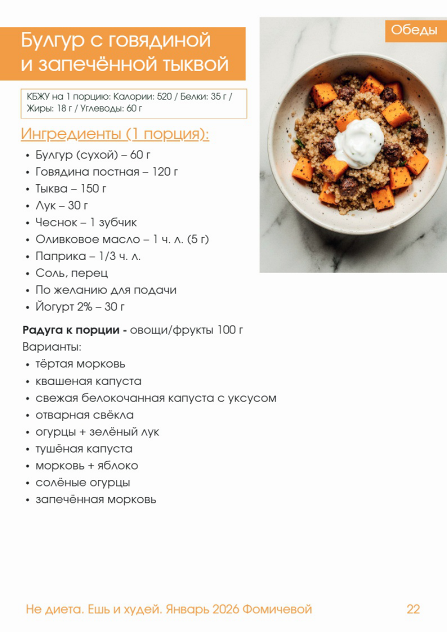 Булгур с говядиной Обеды и запечённой тыквой КБЖУ на 1 порцию: Калории: 520 / Белки: 35 г / Жиры: 18 г / Углеводы: 60 г Ингредиенты (1 порция); - Булгур (сухой) - 60 г - Говядина постная - 120 г - Тыква - 150 г - Лук - 30 г - Чеснок - 1 зубчик - Оливковое масло - 1 чл (5 г - Паприка - 1/3 чл - Соль, перец - По желанию для подачи - Йогурт 2% - 30 г Радуга к порции - овощи/фрукты 100 г варианты: - тёртая морковь - квашеная капуста - свежая белокочанная капуста с уксусом - отварная свёкла - огурцы + зелёный лук - тушёная капуста - морковь + яблоко - солёные огурцы - запечённая морковь Обеды Ингредиенты (6 порций): - Булгур - 360 г - Говядина - 720 г - Тыква - 900 г - Лук - 180 г - Чеснок - 6 зубчиков - Оливковое масло - 30 г - Паприка - 2 чл - Йогурт - 180 г Приготовление: 1. Тыкву нарежьте кубиком, смешайте с половиной масла и паприкой. 2. Запекайте при 180 C 20-25 минут до мягкости и лёгкой румяности. 3. Булгур отварите по инструкции (примерно в соотношении 1:2 с водой). 4. На оставшемся масле обжарьте лук и чеснок до мягкости. 5. Добавьте говядину и готовьте 7-10 минут до румяности. 6. Посолите и поперчите по вкусу. 7. Соедините булгур, говядину и запечённую тыкву, аккуратно перемешайте. 8. При подаче можно добавить ложку йогурта - он освежает и балансирует сладость тыквы. 9. К порции добавьте радугу овощи/фрукты 100 г Варианты: - тёртая морковь - квашеная капуста - свежая белокочанная капуста с уксусом - отварная свёкла - огурцы + зелёный лук - тушёная капуста - морковь + яблоко - солёные огурцы - запечённая морковь
