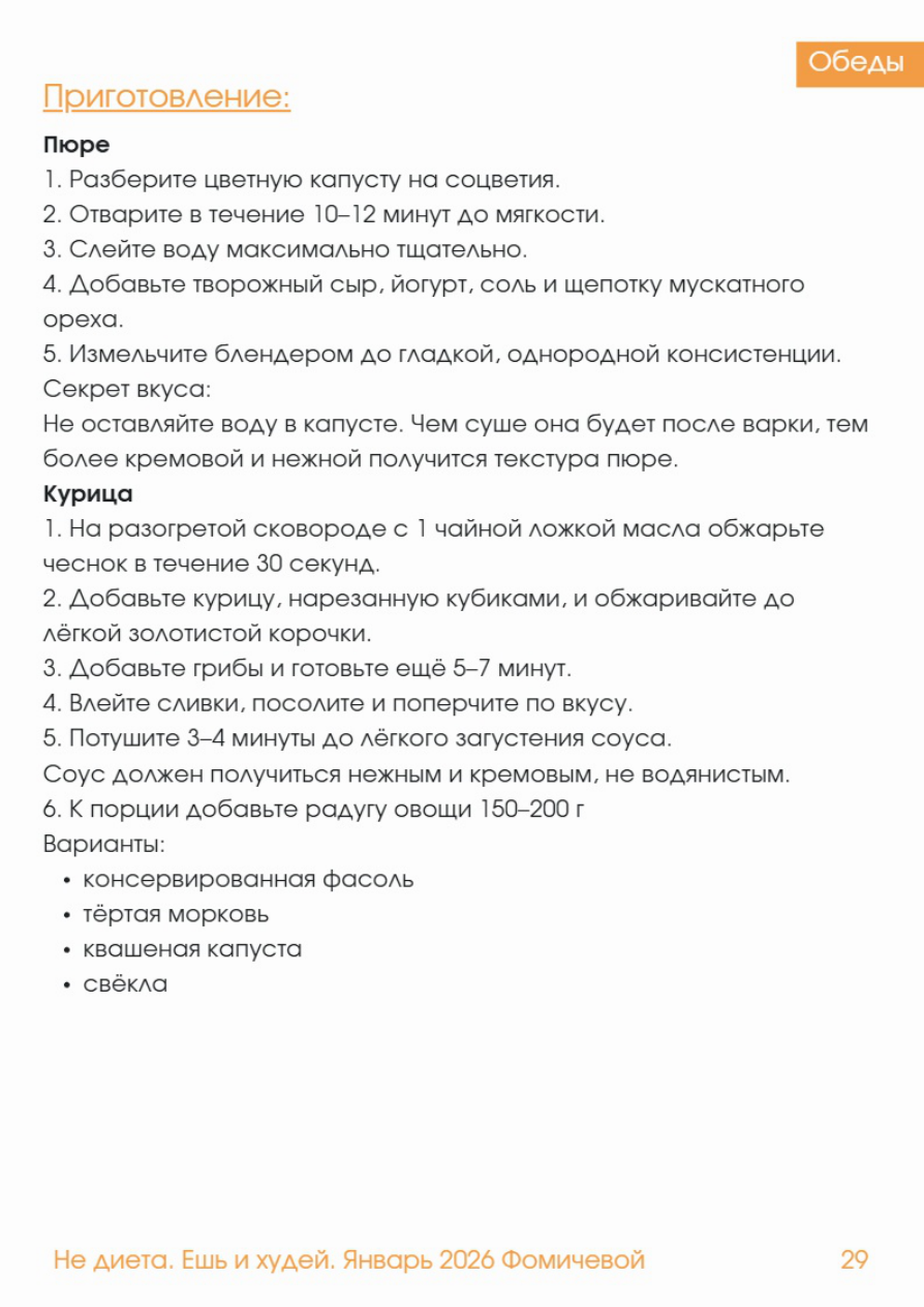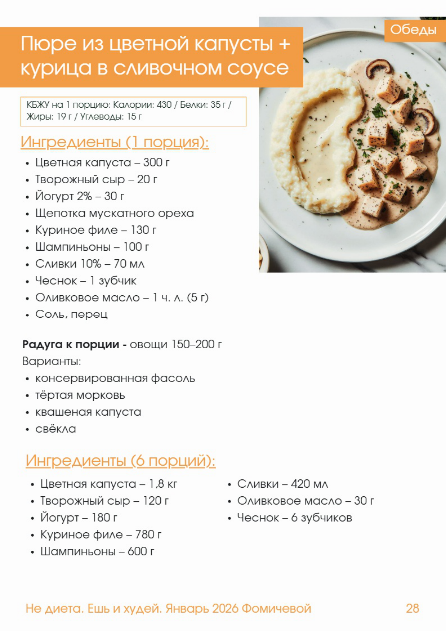 Обеды Пюре из цветной капусты + курица в сливочном соусе КБЖУ на 1 порцию: Калории: 430 / Белки: 35 г / Жиры: 19 г / Углеводы: 15 г Ингредиенты (1 порция); - Цветная капуста - 300 г - Творожный сыр - 20 г - Йогурт 2% - 30 г - Щепотка мускатного ореха - Куриное филе - 130 г - Шампиньоны - 100 г - Сливки 10% - 70 мл - Чеснок - 1 зубчик - Оливковое масло - 1 чл (5 г - Соль, перец Радуга к порции - овощи 150-200 г Варианты: - консервированная фасоль - тёртая морковь - квашеная капуста - свёкла Ингредиенты (6 порций); - Цветная капуста - 1,8 кг - Сливки - 420 мл - Творожный сыр - 120 г - Оливковое масло - 30 г - Йогурт - 180 г - Чеснок - 6 зубчиков - Куриное филе - 780 г - Шампиньоны - 600 г Обеды Приготовление: Пюре 1. Разберите цветную капусту на соцветия. 2. Отварите в течение 10-12 минут до мягкости. 3. Слейте воду максимально тщательно. 4. Добавьте творожный сыр, йогурт, соль и щепотку мускатного ореха. 5. Измельчите блендером до гладкой, однородной консистенции. Секрет вкуса: Не оставляйте воду в капусте. Чем суше она будет после варки, тем более кремовой и нежной получится текстура пюре. Курица 1. На разогретой сковороде с 1 чайной ложкой масла обжарьте чеснок в течение 30 секунд. 2. Добавьте курицу, нарезанную кубиками, и обжаривайте до лёгкой золотистой корочки. 3. Добавьте грибы и готовьте ещё 5-7 минут. 4. Влейте сливки, посолите и поперчите по вкусу. 5. Потушите 3-4 минуты до лёгкого загустения соуса. Соус должен получиться нежным и кремовым, не водянистым. 6. К порции добавьте радугу овощи 150-200 г Варианты: - консервированная фасоль - тёртая морковь - квашеная капуста - свёкла
