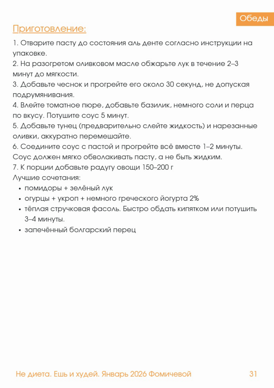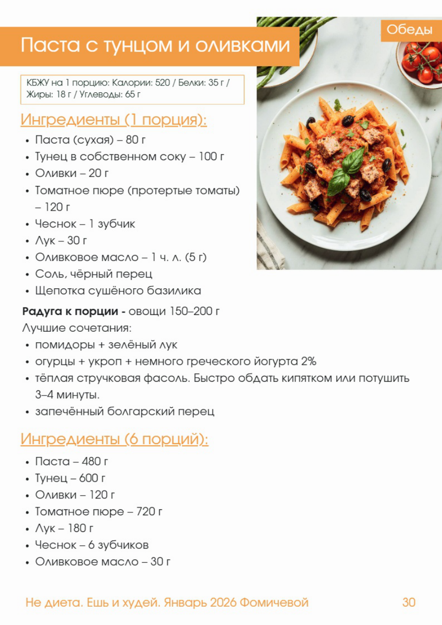 Обеды Паста с тунцом и оливками КБЖУ на 1 порцию: Калории: 520 / Белки: 35 г / Жиры: 18 г / Углеводы: 65 г Ингредиенты (1 порция): - Паста (сухая) - 80 г - Тунец в собственном соку - 100 г - Оливки - 20 г - Томатное пюре (протертые томаты) - 120 г - Чеснок - 1 зубчик - Лук - 30 г - Оливковое масло - 1 чл (5 г - Соль, чёрный перец - Щепотка сушёного базилика Радуга к порции - овощи 150-200 г Лучшие сочетания: - помидоры + зелёный лук - огурцы + укроп + немного греческого йогурта 2% - тёплая стручковая фасоль. Быстро обдать кипятком или потушить 3-4 минуты. - запечённый болгарский перец Ингредиенты (6 порций): - Паста - 480 г - Тунец - 600 г - Оливки - 120 г - Томатное пюре - 720 г - Лук - 180 г - Чеснок - 6 зубчиков - Оливковое масло - 30 г Обеды Приготовление: 1. Отварите пасту до состояния аль денте согласно инструкции на упаковке. 2. На разогретом оливковом масле обжарьте лук в течение 2-3 минут до мягкости. 3. Добавьте чеснок и прогрейте его около 30 секунд, не допуская подрумянивания. 4. Влейте томатное пюре, добавьте базилик, немного соли и перца по вкусу. Потушите соус 5 минут. 5. Добавьте тунец (предварительно слейте жидкость) и нарезанные оливки, аккуратно перемешайте. 6. Соедините соус с пастой и прогрейте всё вместе 1-2 минуты. Соус должен мягко обволакивать пасту, а не быть жидким. 7. К порции добавьте радугу овощи 150-200 г Лучшие сочетания: - помидоры + зелёный лук - огурцы + укроп + немного греческого йогурта 2% - тёплая стручковая фасоль. Быстро обдать кипятком или потушить 3-4 минуты. - запечённый болгарский перец Не диета. Ешь 1 худей. Январь 202