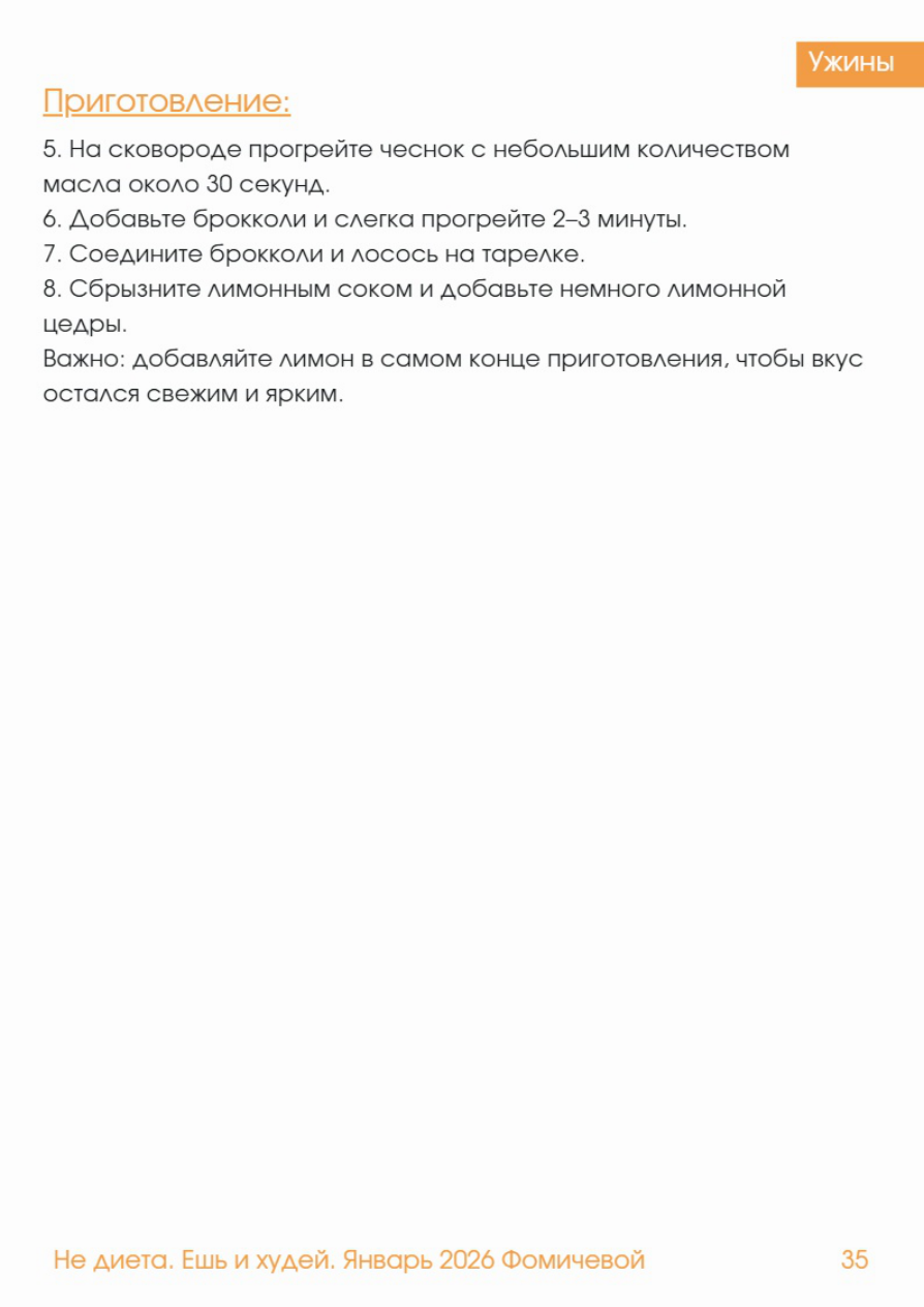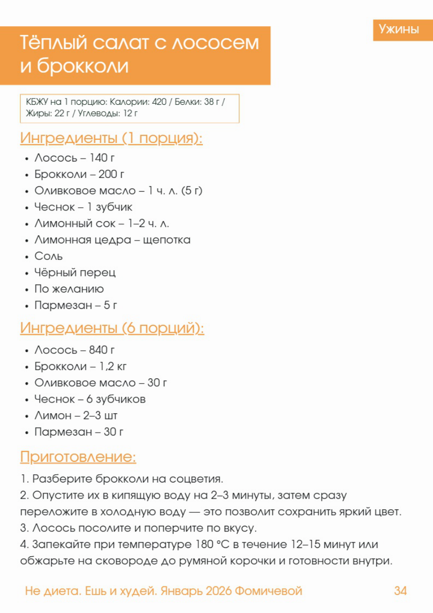 Ужины Теплый салат с лососем и брокколи КБЖУ на 1 порцию: Калории: 420 / Белки: 38 г / Жиры: 22 г / Углеводы: 12 г Ингредиенты (1 порция); - Лосось - 140 г - Брокколи - 200 г - Оливковое масло - 1 чл (5 г - Чеснок - 1 зубчик - Лимонный сок - 1-2 чл - Лимонная цедра - щепотка - Соль - Чёрный перец - По желанию - Пармезан - 5 г Ингредиенты (6 порций); - Лосось - 840 г - Брокколи - 1,2 кг - Оливковое масло - 30 г - Чеснок - 6 зубчиков - Лимон - 2-3 шт - Пармезан - 30 г Приготовление: 1. Разберите брокколи на соцветия. 2. Опустите их в кипящую воду на 2-3 минуты, затем сразу переложите в холодную воду - это позволит сохранить яркий цвет. 3. Лосось посолите и поперчите по вкусу. 4. Запекайте при температуре 180 Св течение 12-15 минут или обжарьте на сковороде до румяной корочки и готовности внутри. Ужины Приготовление: 5. На сковороде прогрейте чеснок с небольшим количеством масла около 30 секунд. 6. Добавьте брокколи и слегка прогрейте 2-3 минуты. 7. Соедините брокколи и лосось на тарелке. 8. Сбрызните лимонным соком и добавьте немного лимонной цедры. Важно: добавляйте лимон в самом конце приготовления, чтобы вкус остался свежим и ярким. Не диета. Ешь 1 худей. Январь 202