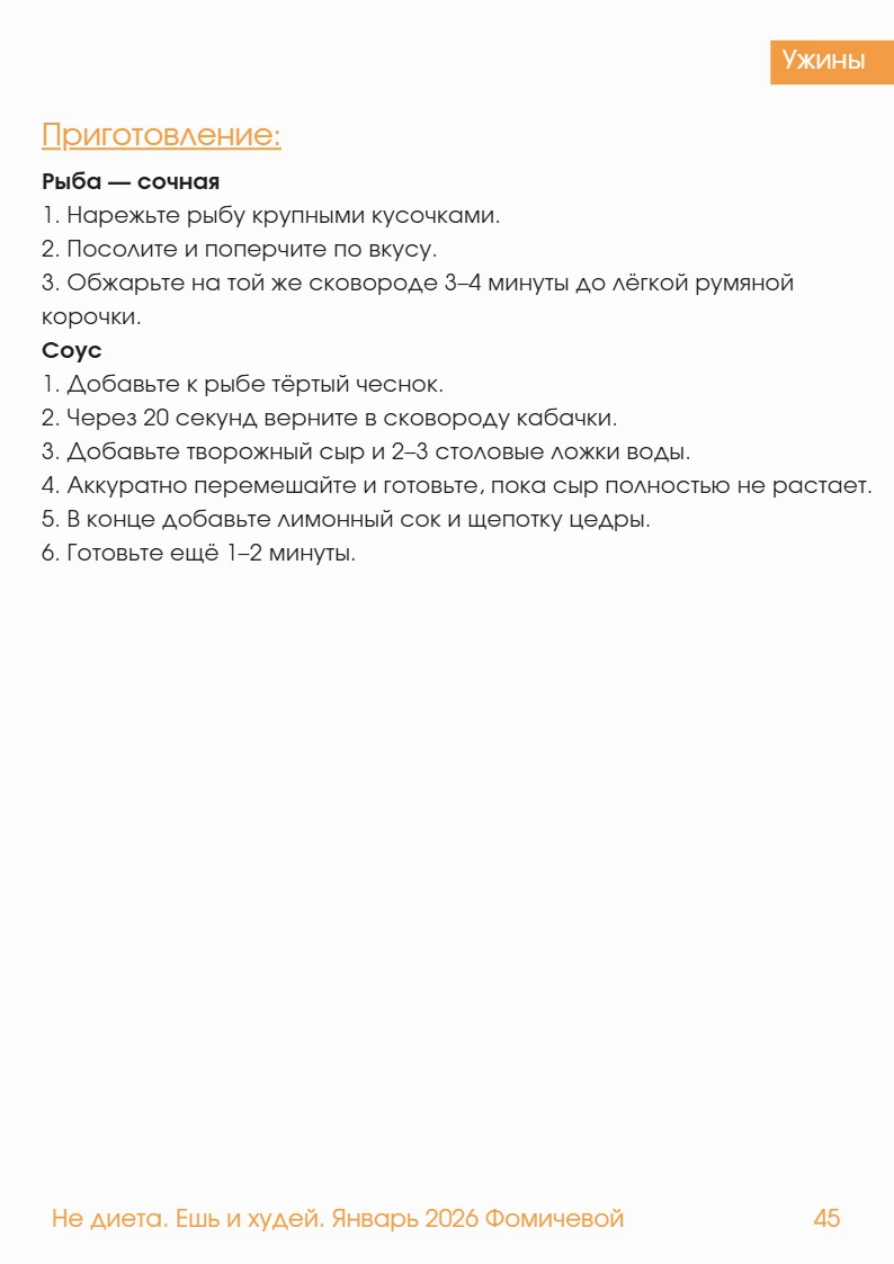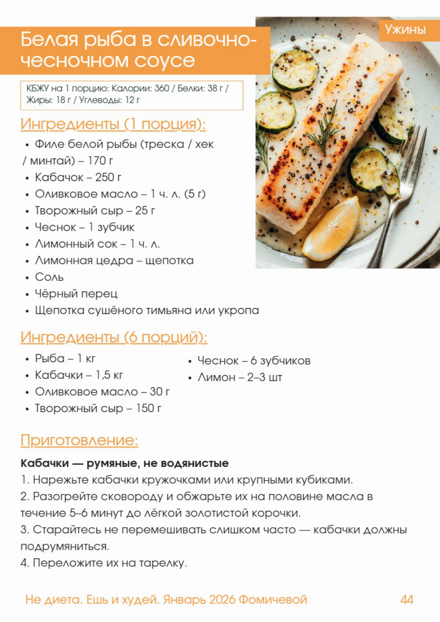 Белая рыба в сливочно- Ужины чесночном соусе КБЖУ на 1 порцию: Калории: 360 / Белки: 38 г / Жиры: 18 г / Углеводы: 12 г Ингредиенты (1 порция); - Филе белой рыбы (треска / хек / минтай) - 170 г - Кабачок - 250 г - Оливковое масло - 1 чл (5 г - Творожный сыр - 25 г - Чеснок - 1 зубчик - Лимонный сок - 1 чл - Лимонная цедра - щепотка - Соль - Чёрный перец - Щепотка сушёного тимьяна или укропа Ингредиенты (6 порций); - Рыба - 1 кг - Чеснок - 6 зубчиков - Кабачки - 1,5 кг - Лимон - 2-3 шт - Оливковое масло - 30 г - Творожный сыр - 150 г Приготовление: Кабачки - румяные, не водянистые 1. Нарежьте кабачки кружочками или крупными кубиками. 2. Разогрейте сковороду и обжарьте их на половине масла в течение 5-6 минут до лёгкой золотистой корочки. 3. Старайтесь не перемешивать слишком часто - кабачки должны подрумяниться. 4. Переложите их на тарелку. Ужины Приготовление: Рыба - сочная 1. Нарежьте рыбу крупными кусочками. 2. Посолите и поперчите по вкусу. 3. Обжарьте на той же сковороде 3-4 минуты до лёгкой румяной корочки. Соус 1. Добавьте к рыбе тёртый чеснок. 2. Через 20 секунд верните в сковороду кабачки. 3. Добавьте творожный сыр и 2-3 столовые ложки воды. 4. Аккуратно перемешайте и готовьте, пока сыр полностью не растает. 5. В конце добавьте лимонный сок и щепотку цедры. 6. Готовьте ещё 1-2 минуты. Не диета. Ешь 1 худей. Январь 202
